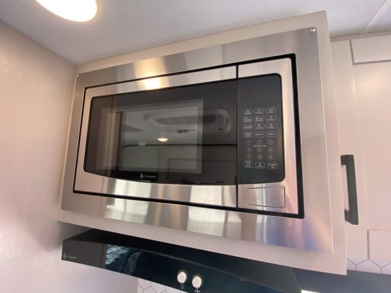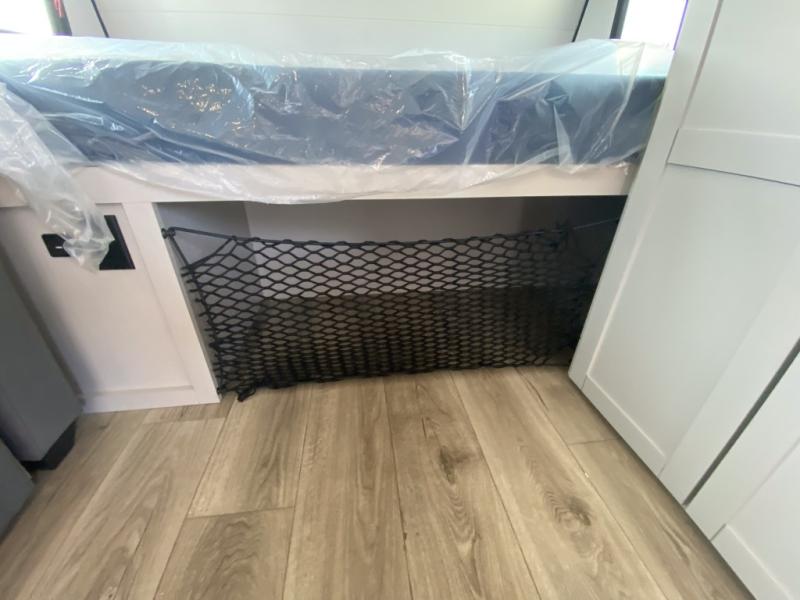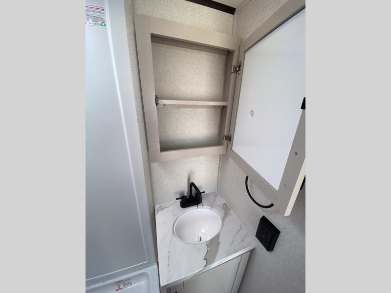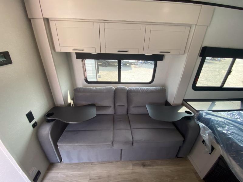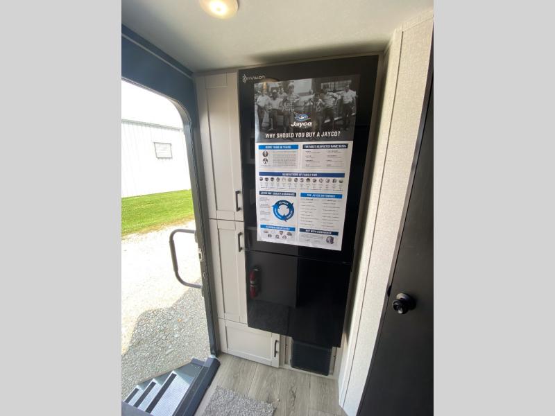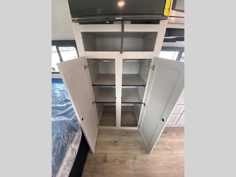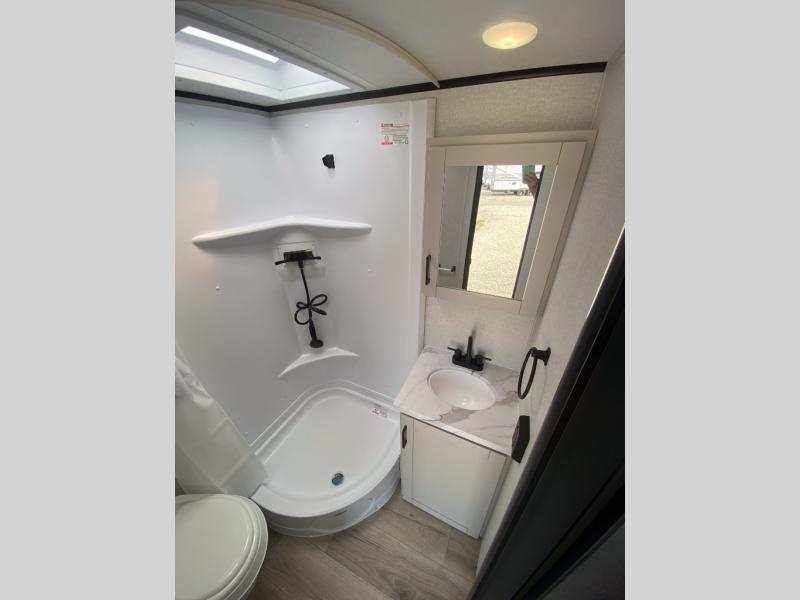 The perfect couple's trailer is found with this Jay Feather Air! You can sleep soundly each night on the front queen bed that includes a large overhead cabinet for books, board games and more. There is also a TV cabinet with a wardrobe below for even more storage. A Jack-knife sofa slide out includes table trays, giving you a place to dine together, and an overnight guest could sleep here if needed. Whip up your best meals on the two burner cooktop or in the microwave, and there is a refrigerator plus a pantry for food storage. The full bath includes a radius shower, a sink with a medicine cabinet, and a toilet with an overhead cabinet to keep all your toiletries tucked away.