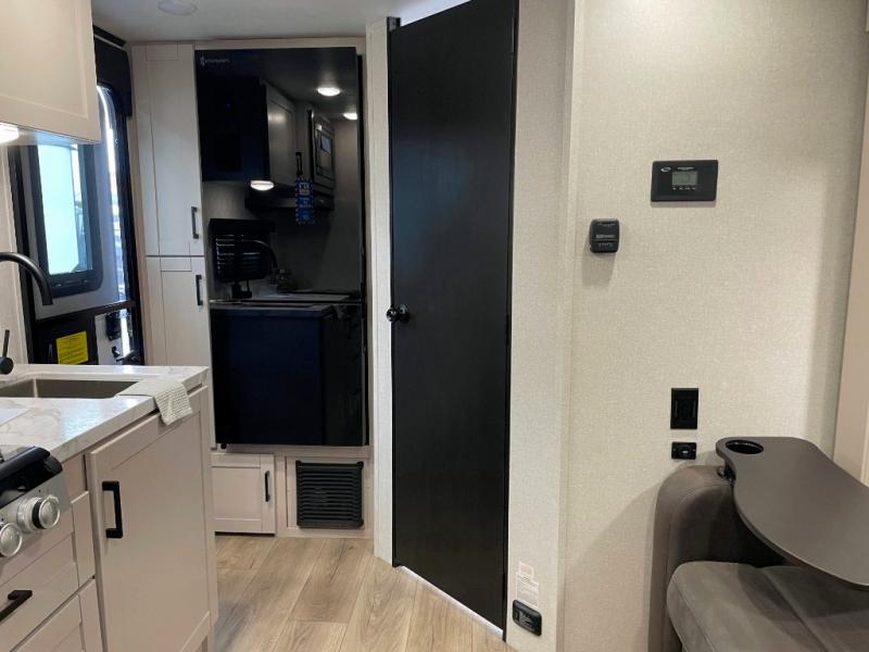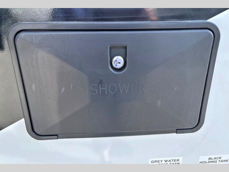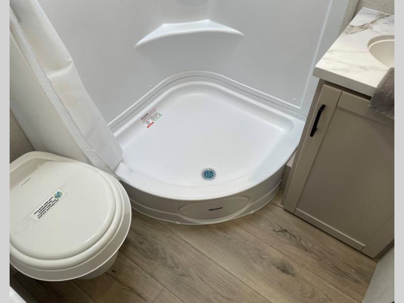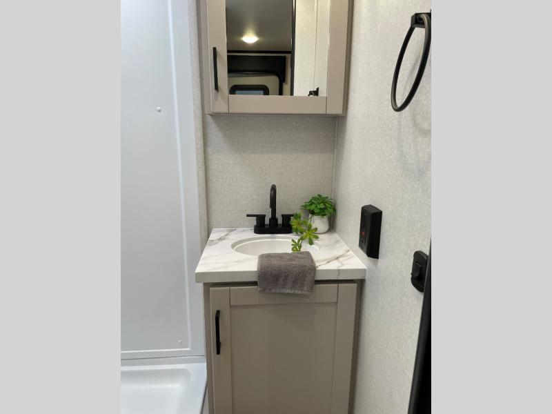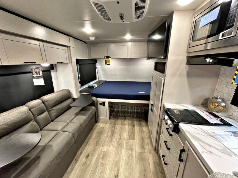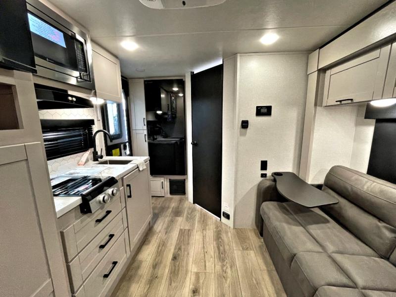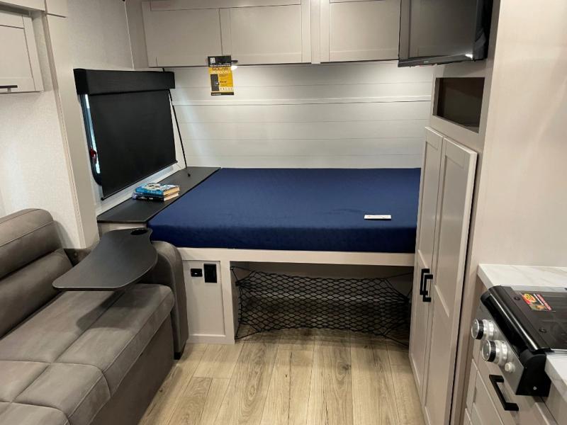 The perfect couple's trailer is found with this Jay Feather Air! You can sleep soundly each night on the front queen bed that includes a large overhead cabinet for books, board games and more. There is also a TV cabinet with a wardrobe below for even more storage. A Jack-knife sofa slide out includes table trays, giving you a place to dine together, and an overnight guest could sleep here if needed. Whip up your best meals on the two burner cooktop or in the microwave, and there is a refrigerator plus a pantry for food storage. The full bath includes a radius shower, a sink with a medicine cabinet, and a toilet with an overhead cabinet to keep all your toiletries tucked away.
