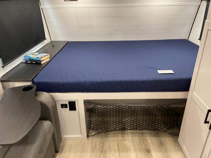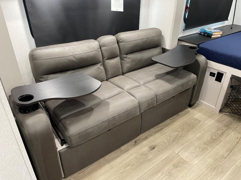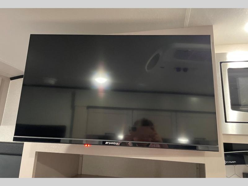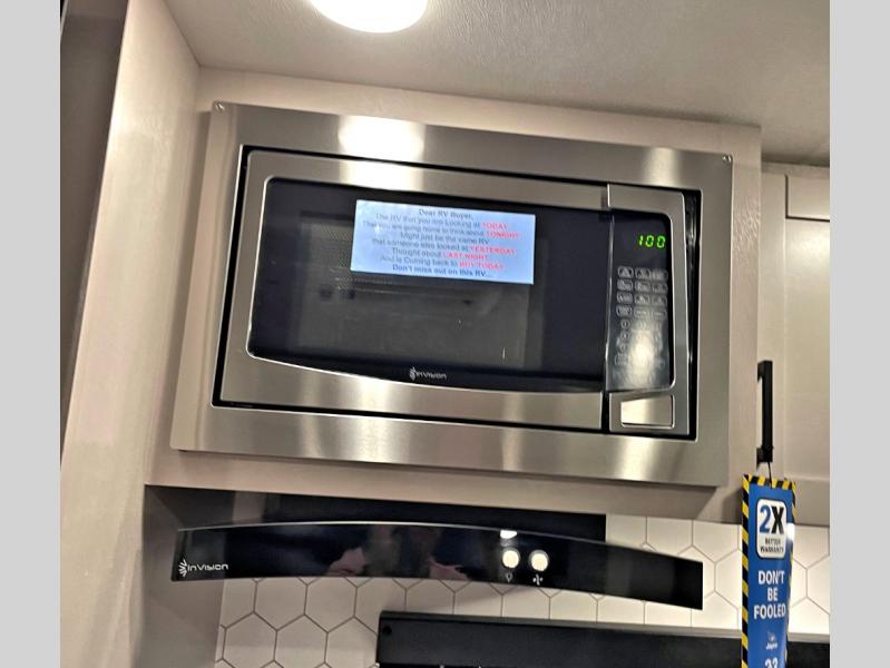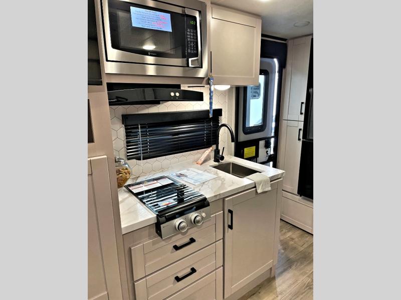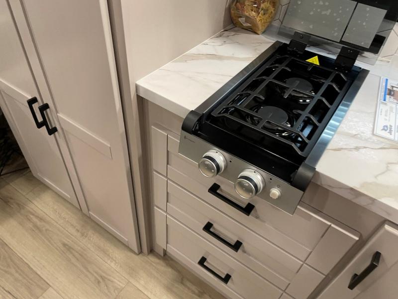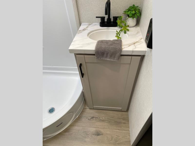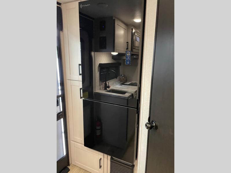 The perfect couple's trailer is found with this Jay Feather Air! You can sleep soundly each night on the front queen bed that includes a large overhead cabinet for books, board games and more. There is also a TV cabinet with a wardrobe below for even more storage. A Jack-knife sofa slide out includes table trays, giving you a place to dine together, and an overnight guest could sleep here if needed. Whip up your best meals on the two burner cooktop or in the microwave, and there is a refrigerator plus a pantry for food storage. The full bath includes a radius shower, a sink with a medicine cabinet, and a toilet with an overhead cabinet to keep all your toiletries tucked away.