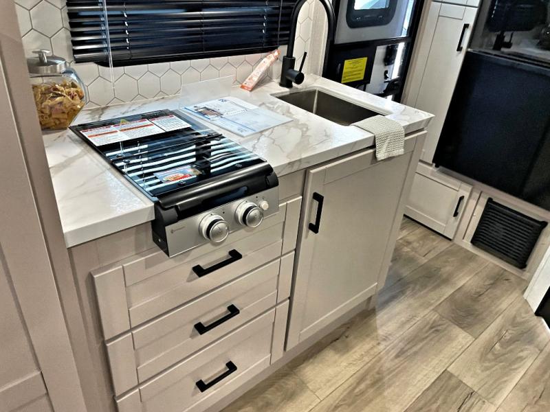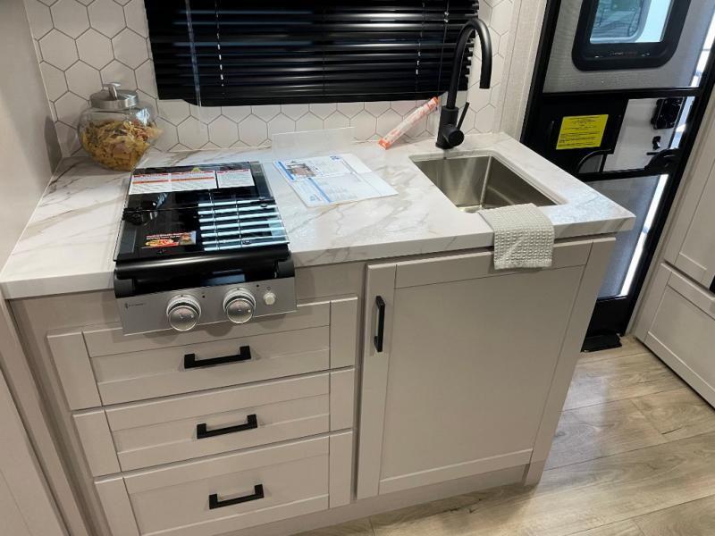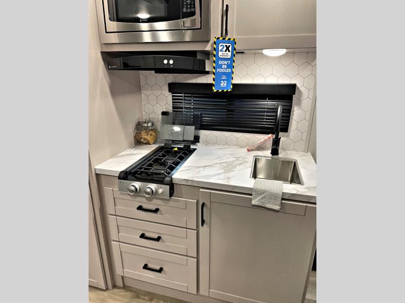 With any Jay Feather Air travel trailer by Jayco, you will enjoy lightweight towing and a variety of features to make each camping trip count! The Climate Shield insulation system helps extend your camping season by keeping you comfortable even in extreme weather conditions, and the Rock Solid stabilizer system means set up will be a breeze. An 18" rear roof ladder lets you easily clean the top of your Magnum Truss roof, and the 2" receiver will be perfect for your bike rack. The Overland 1 Solar Package with a 200W solar panel and 30-amp controller will provide off-grid capabilities, or you can can choose the optional Overland 2 Solar Package with two panels instead! Each Jay Feather Air includes residential-style seamless countertops inside, along with stainless steel sinks, decorative backsplash, and decorative roller shades with a reflective barrier to help keep the sun's rays out.
