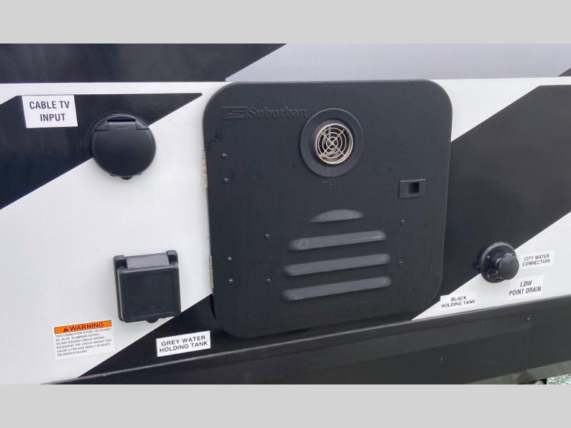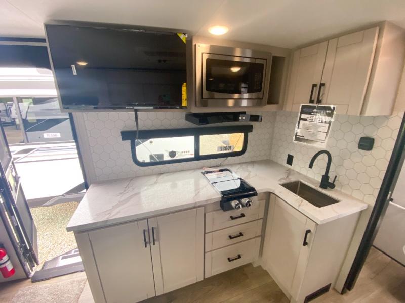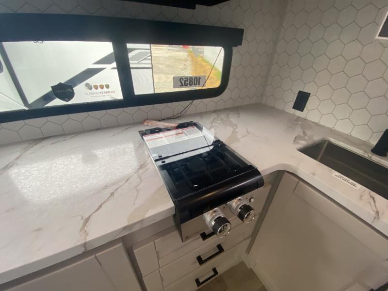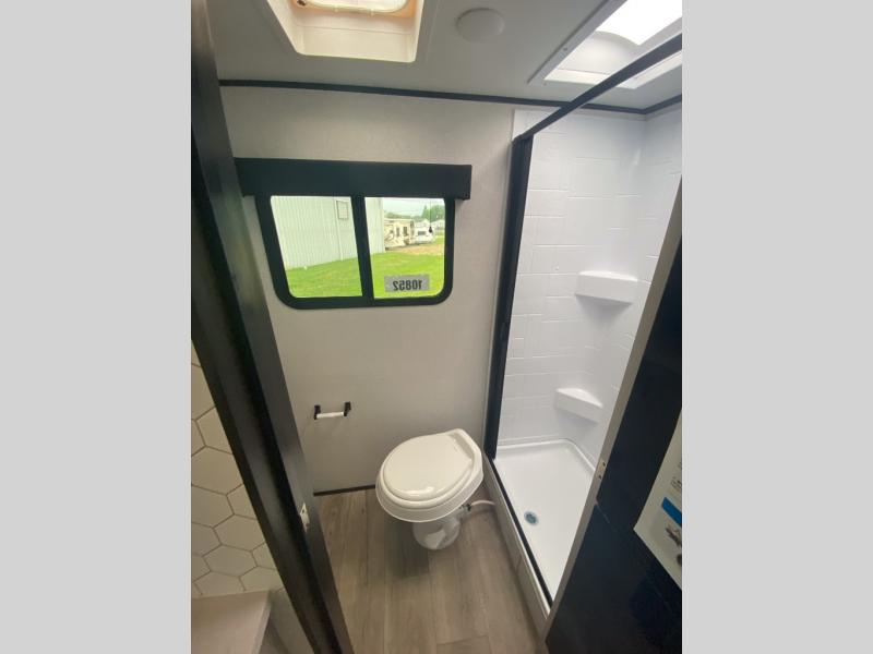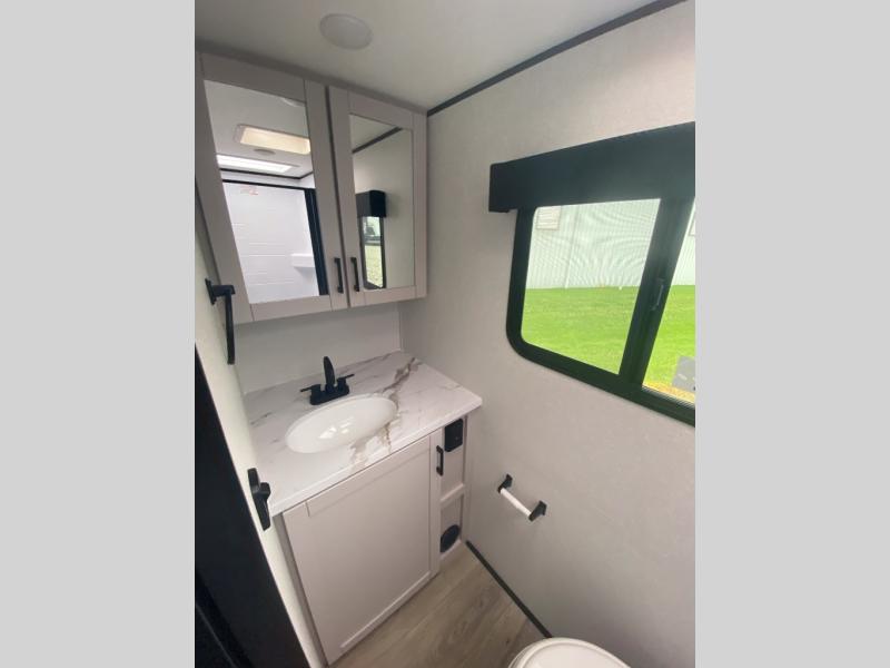 This travel trailer will feel just like home with its front queen bed, full rear bath, and fully-equipped kitchen! There is a jack-knife sofa slide out where you can relax each day, and there are swivel tables so you can enjoy meals here too. The LED Smart TV will let you stay in and watch movies if the weather isn't cooperating, or you can grab the fishing gear from the outside storage and weather the storm! You'll also find plenty of interior storage in the multiple overhead cabinets and the bath medicine cabinet!