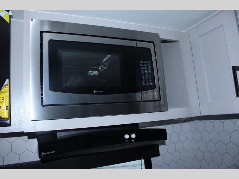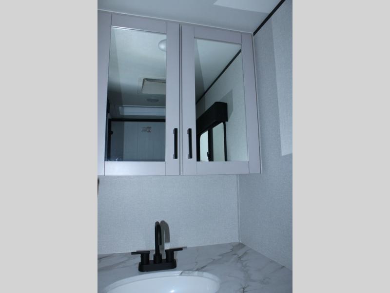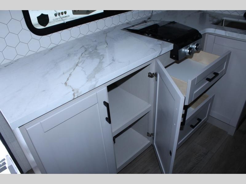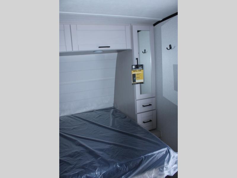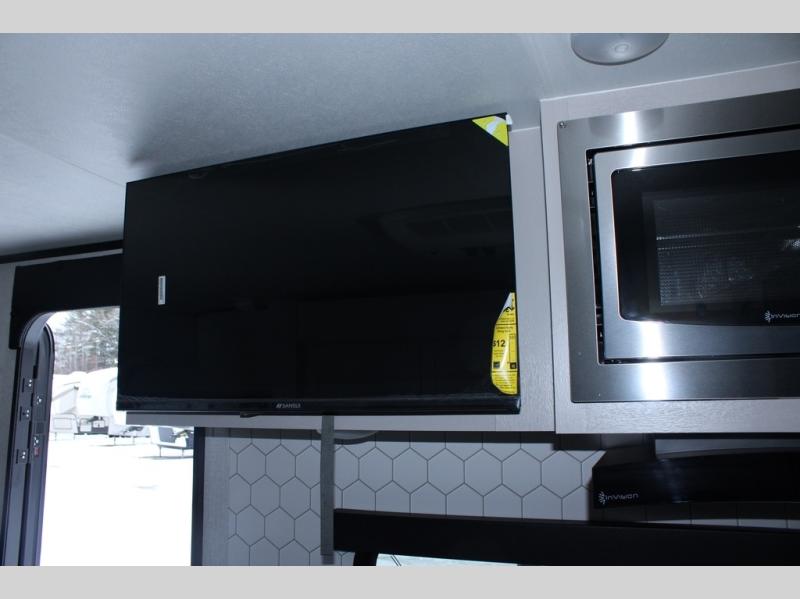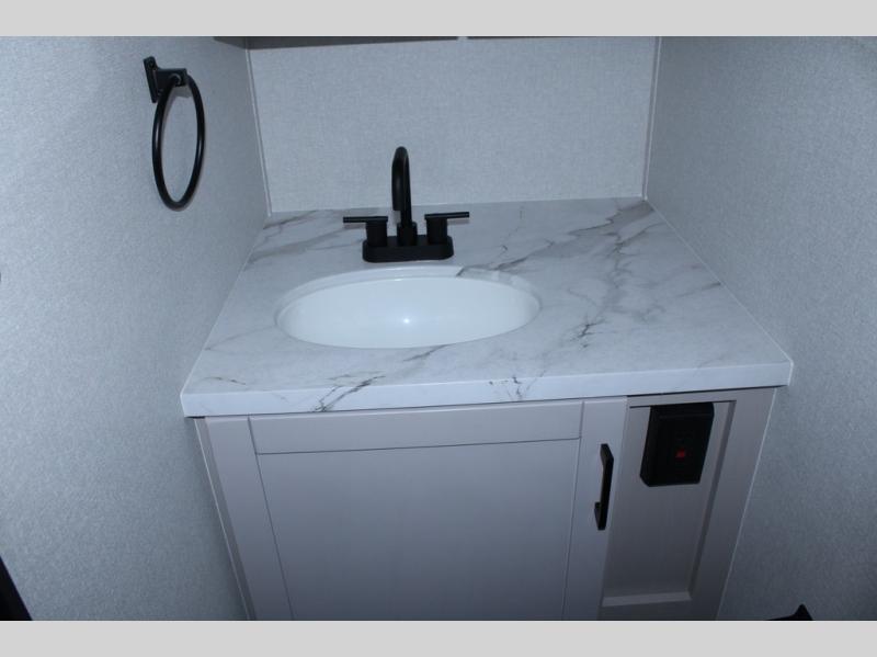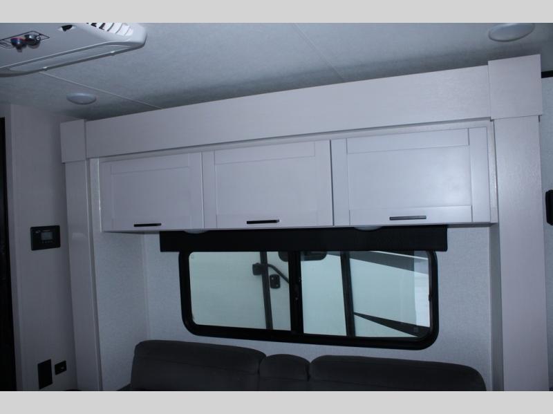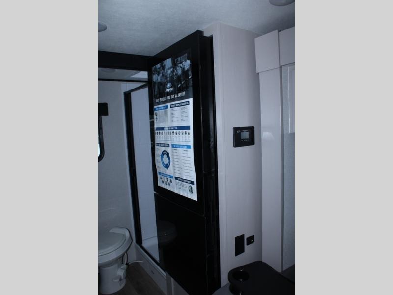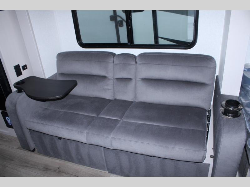 This travel trailer will feel just like home with its front queen bed, full rear bath, and fully-equipped kitchen! There is a jack-knife sofa slide out where you can relax each day, and there are swivel tables so you can enjoy meals here too. The LED Smart TV will let you stay in and watch movies if the weather isn't cooperating, or you can grab the fishing gear from the outside storage and weather the storm! You'll also find plenty of interior storage in the multiple overhead cabinets and the bath medicine cabinet!