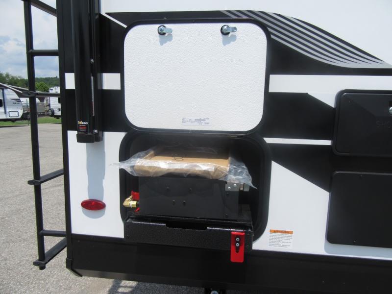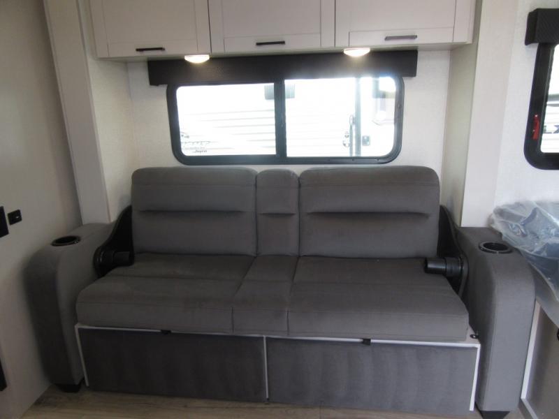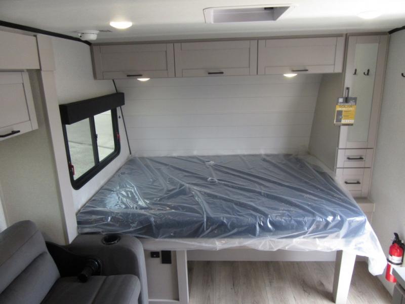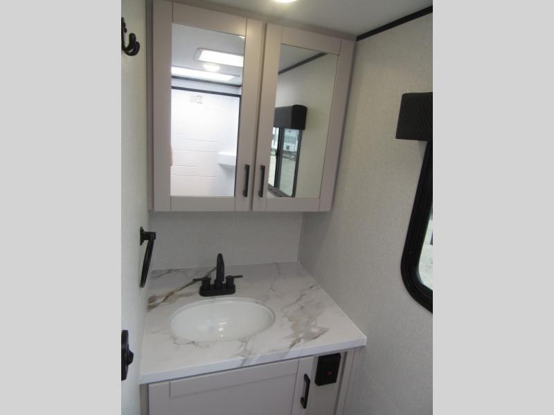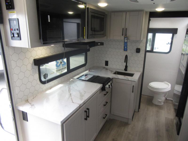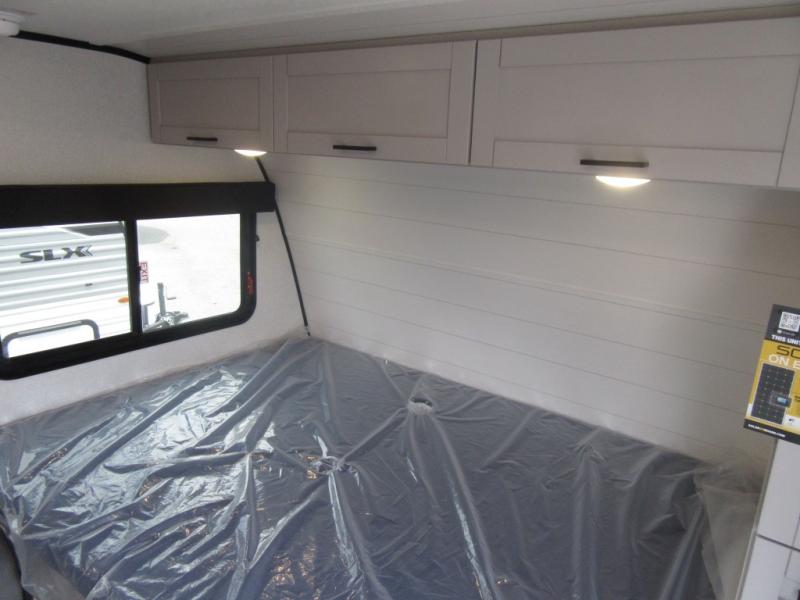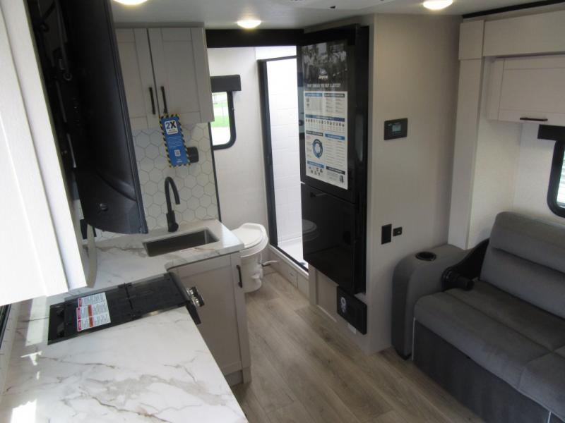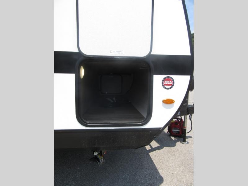 This travel trailer will feel just like home with its front queen bed, full rear bath, and fully-equipped kitchen! There is a jack-knife sofa slide out where you can relax each day, and there are swivel tables so you can enjoy meals here too. The LED Smart TV will let you stay in and watch movies if the weather isn't cooperating, or you can grab the fishing gear from the outside storage and weather the storm! You'll also find plenty of interior storage in the multiple overhead cabinets and the bath medicine cabinet!