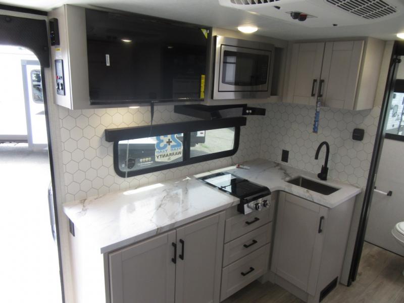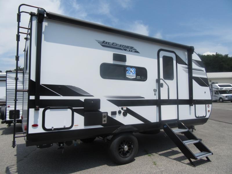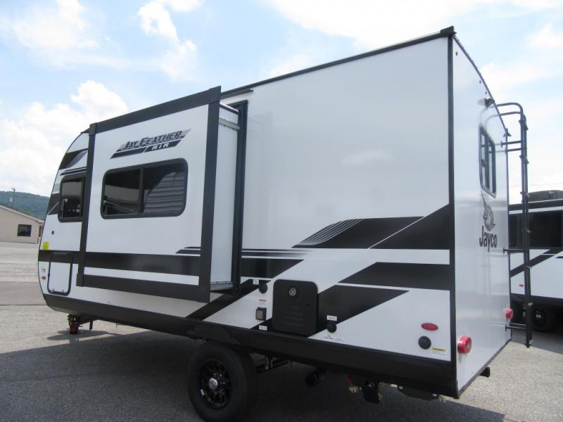 With any Jay Feather Air travel trailer by Jayco, you will enjoy lightweight towing and a variety of features to make each camping trip count! The Climate Shield insulation system helps extend your camping season by keeping you comfortable even in extreme weather conditions, and the Rock Solid stabilizer system means set up will be a breeze. An 18" rear roof ladder lets you easily clean the top of your Magnum Truss roof, and the 2" receiver will be perfect for your bike rack. The Overland 1 Solar Package with a 200W solar panel and 30-amp controller will provide off-grid capabilities, or you can can choose the optional Overland 2 Solar Package with two panels instead! Each Jay Feather Air includes residential-style seamless countertops inside, along with stainless steel sinks, decorative backsplash, and decorative roller shades with a reflective barrier to help keep the sun's rays out.
