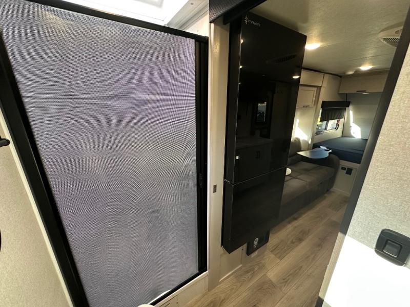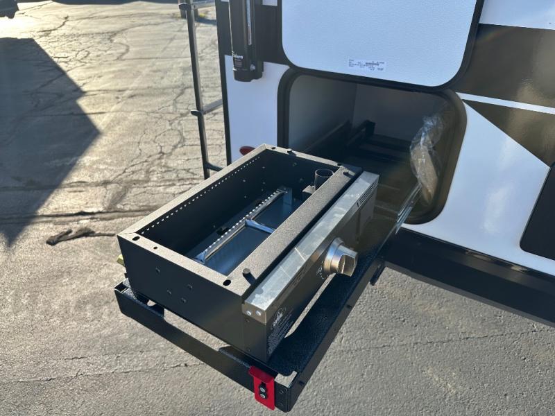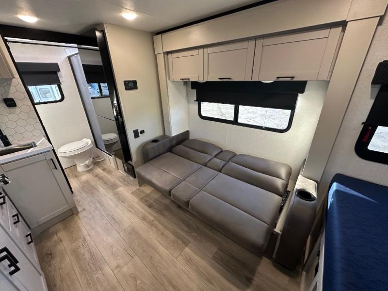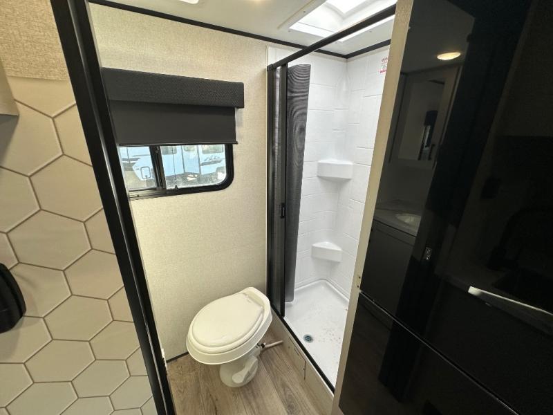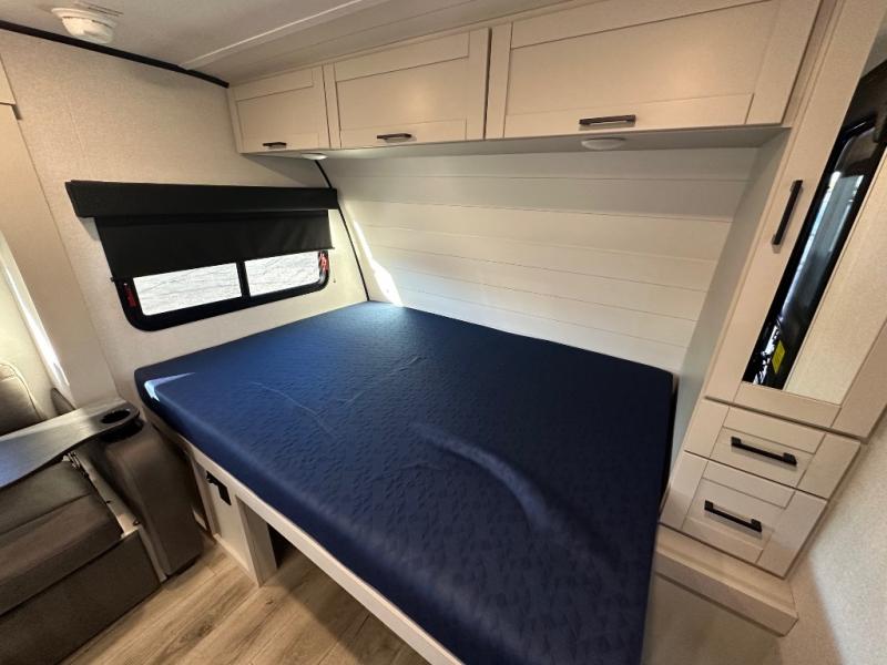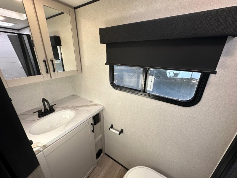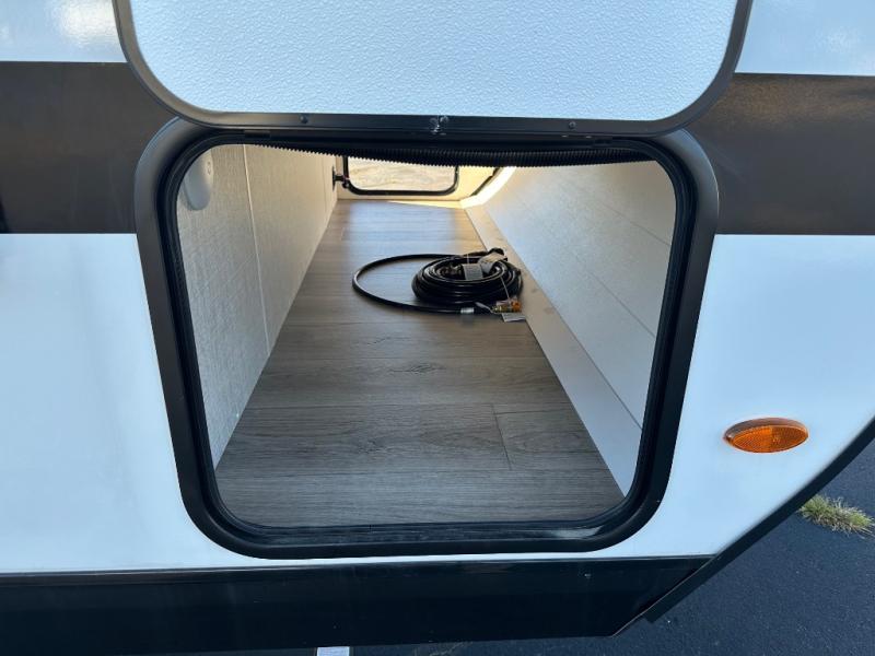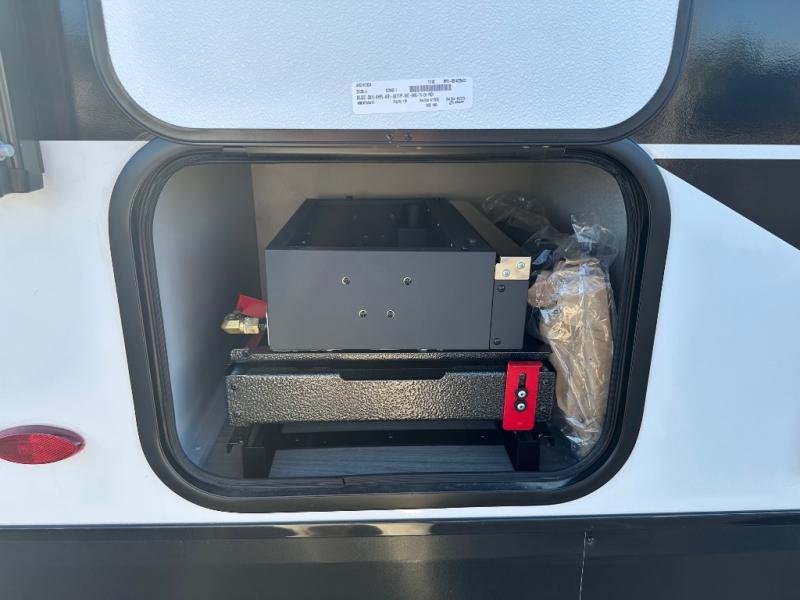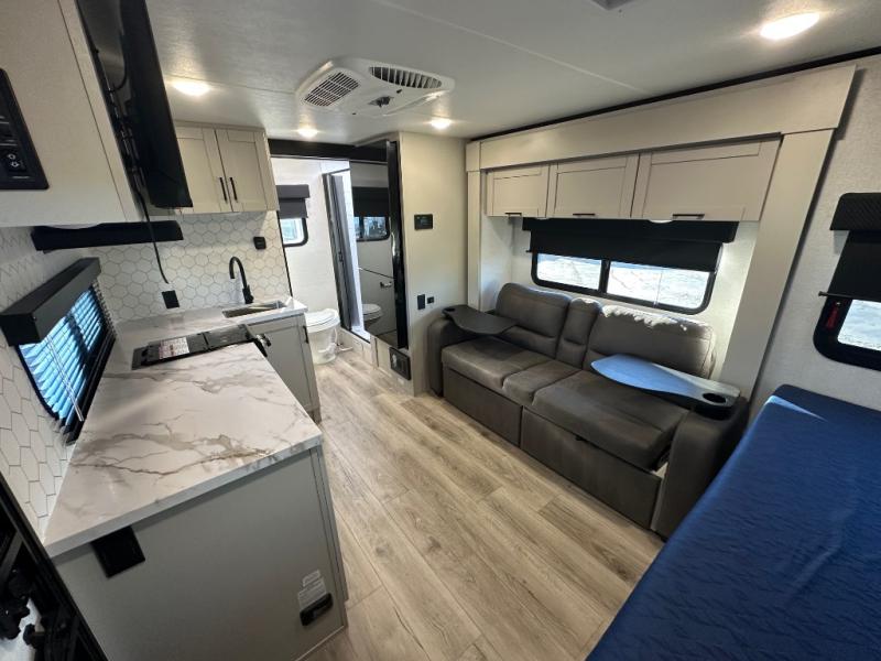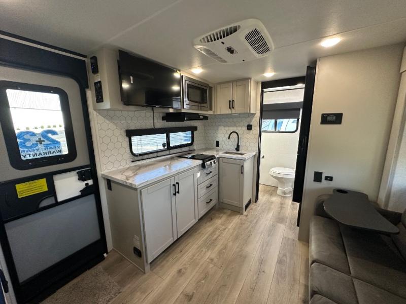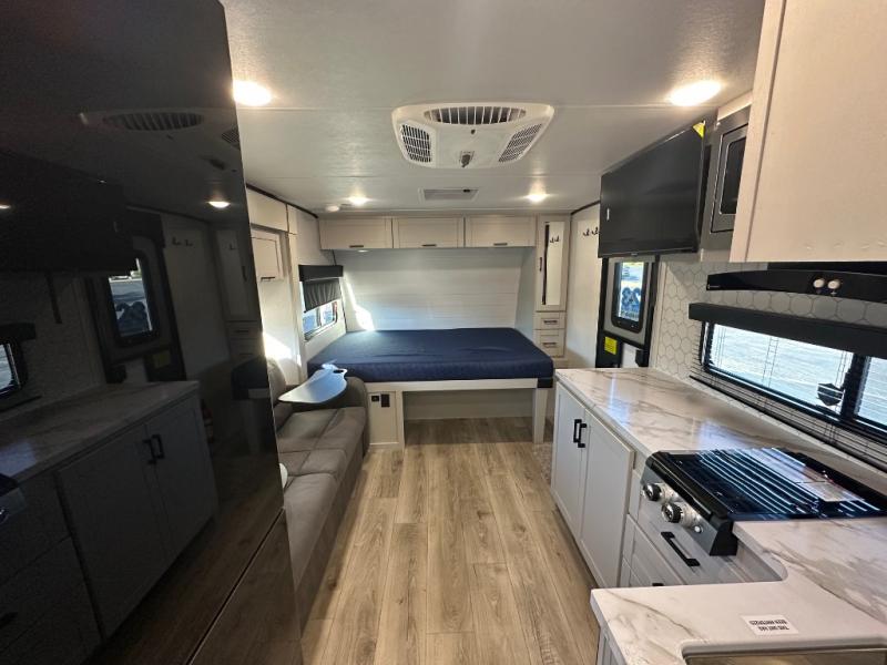 This travel trailer will feel just like home with its front queen bed, full rear bath, and fully-equipped kitchen! There is a jack-knife sofa slide out where you can relax each day, and there are swivel tables so you can enjoy meals here too. The LED Smart TV will let you stay in and watch movies if the weather isn't cooperating, or you can grab the fishing gear from the outside storage and weather the storm! You'll also find plenty of interior storage in the multiple overhead cabinets and the bath medicine cabinet!