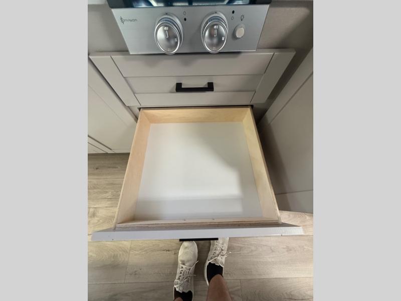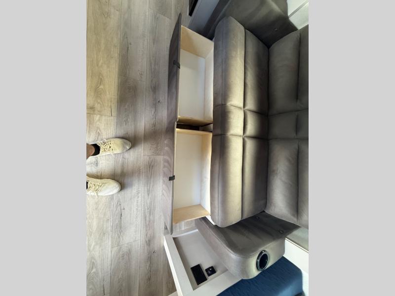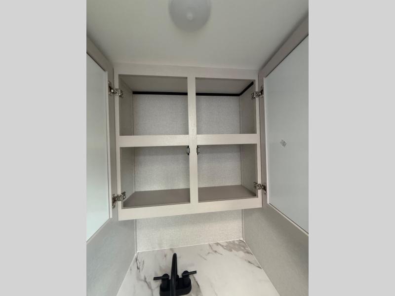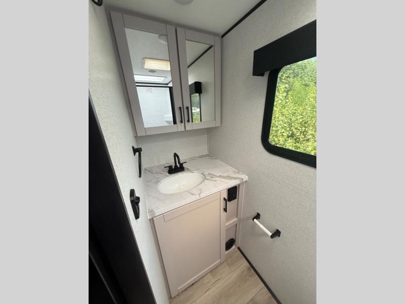 This travel trailer will feel just like home with its front queen bed, full rear bath, and fully-equipped kitchen! There is a jack-knife sofa slide out where you can relax each day, and there are swivel tables so you can enjoy meals here too. The LED Smart TV will let you stay in and watch movies if the weather isn't cooperating, or you can grab the fishing gear from the outside storage and weather the storm! You'll also find plenty of interior storage in the multiple overhead cabinets and the bath medicine cabinet!