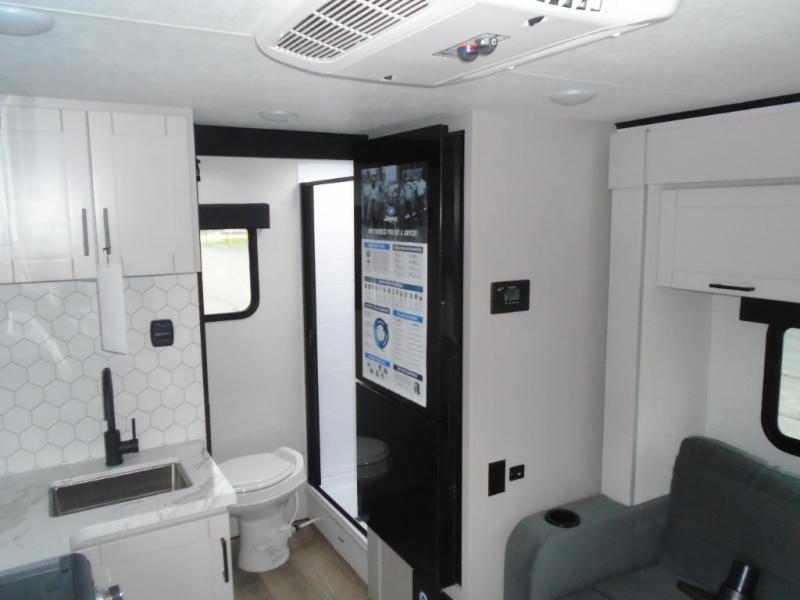 With any Jay Feather Air travel trailer by Jayco, you will enjoy lightweight towing and a variety of features to make each camping trip count! The Climate Shield insulation system helps extend your camping season by keeping you comfortable even in extreme weather conditions, and the Rock Solid stabilizer system means set up will be a breeze. An 18" rear roof ladder lets you easily clean the top of your Magnum Truss roof, and the 2" receiver will be perfect for your bike rack. The Overland 1 Solar Package with a 200W solar panel and 30-amp controller will provide off-grid capabilities, or you can can choose the optional Overland 2 Solar Package with two panels instead! Each Jay Feather Air includes residential-style seamless countertops inside, along with stainless steel sinks, decorative backsplash, and decorative roller shades with a reflective barrier to help keep the sun's rays out.
