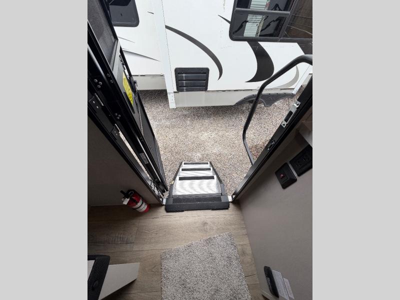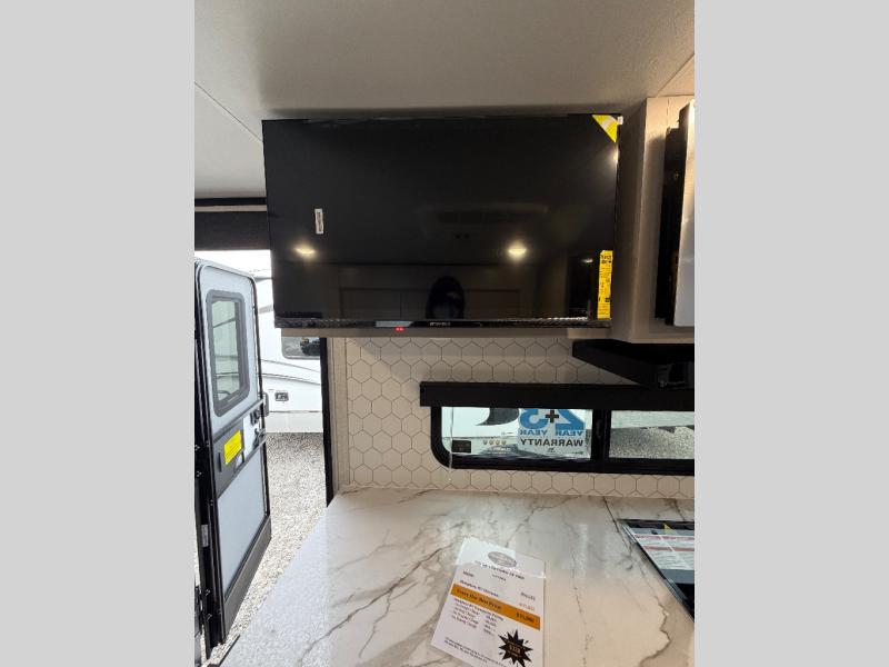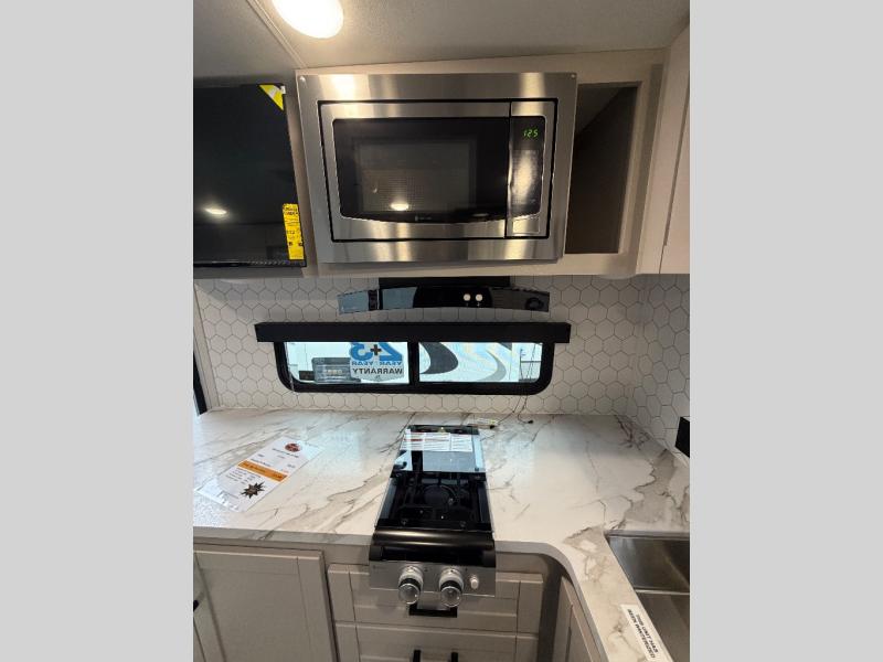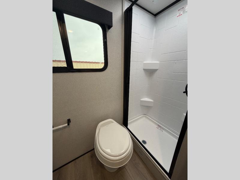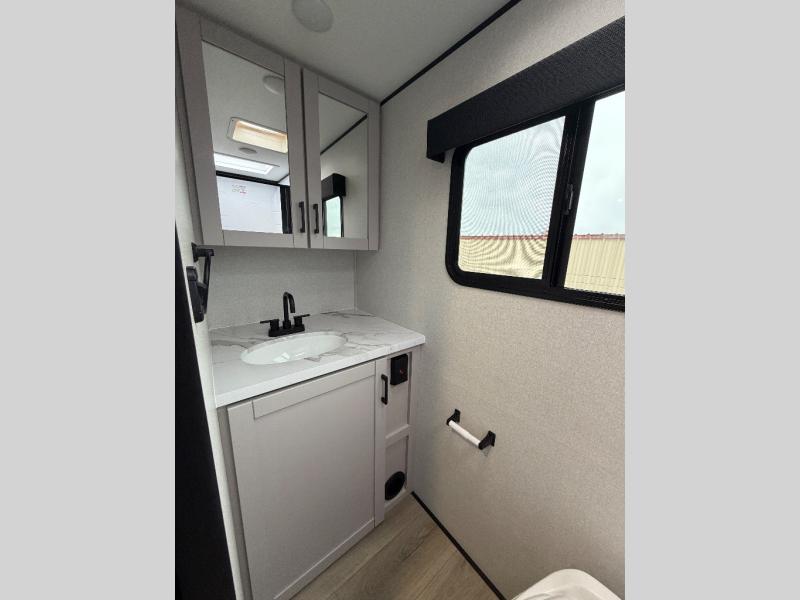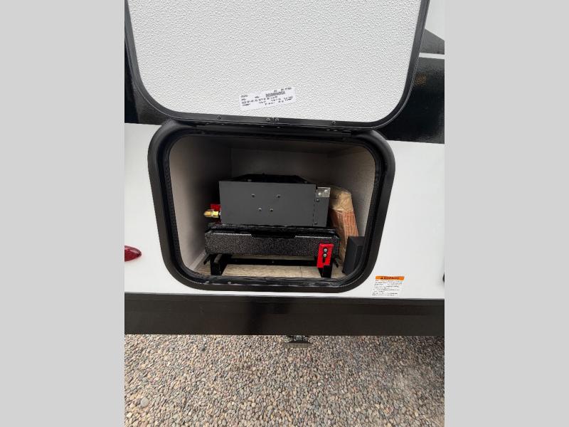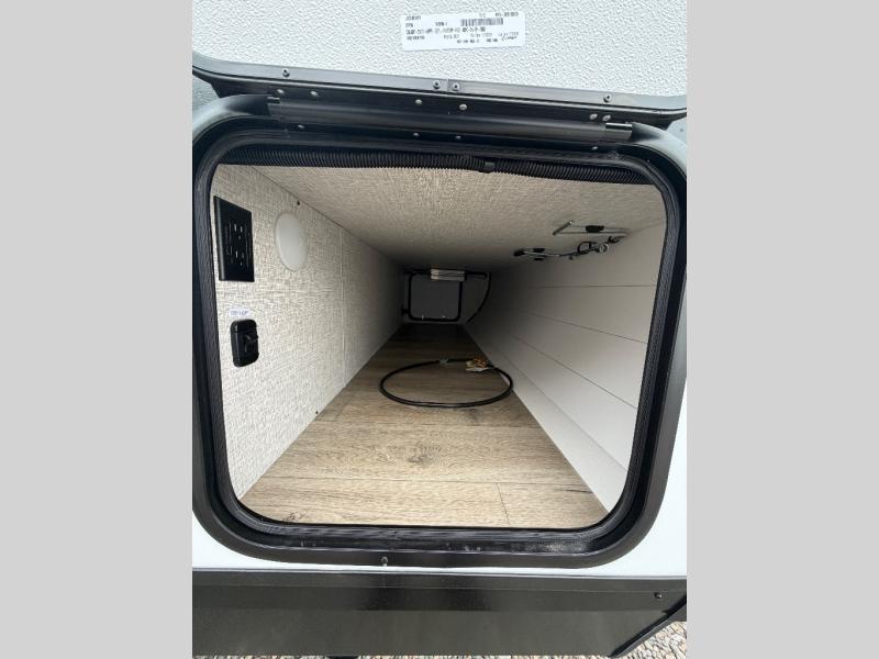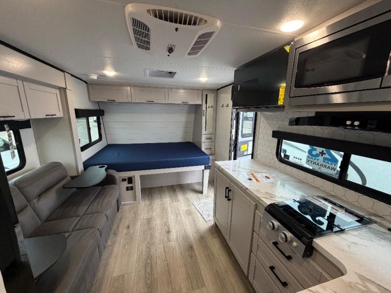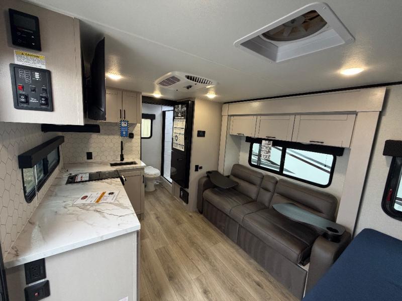 This travel trailer will feel just like home with its front queen bed, full rear bath, and fully-equipped kitchen! There is a jack-knife sofa slide out where you can relax each day, and there are swivel tables so you can enjoy meals here too. The LED Smart TV will let you stay in and watch movies if the weather isn't cooperating, or you can grab the fishing gear from the outside storage and weather the storm! You'll also find plenty of interior storage in the multiple overhead cabinets and the bath medicine cabinet!