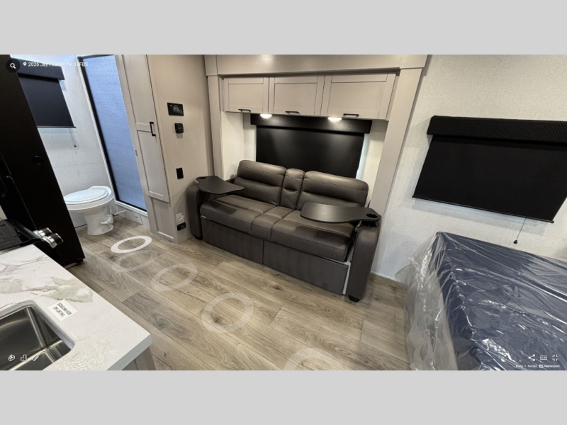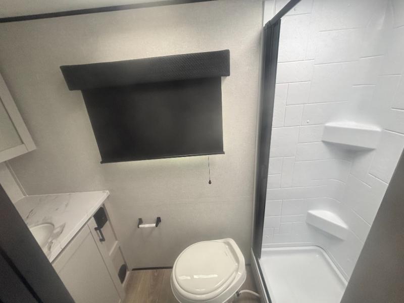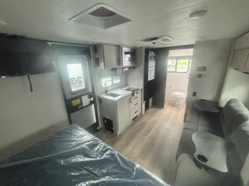 This travel trailer will feel just like home with its front RV queen bed, full rear bath, and fully-equipped kitchen! There is a jack-knife sofa slide out where you can relax each day, and there are swivel sofa tables so you can enjoy meals here too. The TV will let you stay in and watch movies if the weather isn't cooperating, or you can grab the fishing gear from the outside storage and weather the storm! You'll also find plenty of interior storage in the multiple overhead cabinets and the bath medicine cabinet!