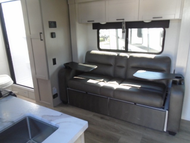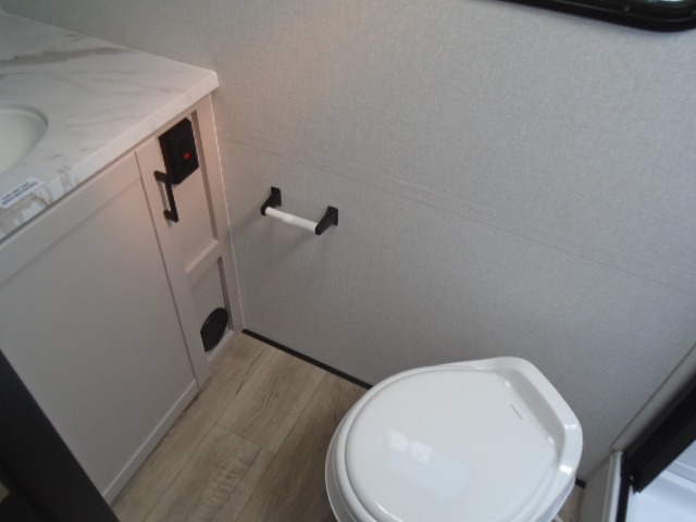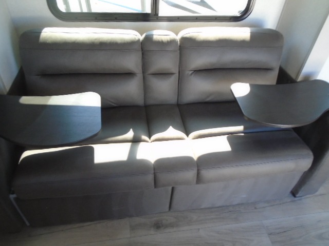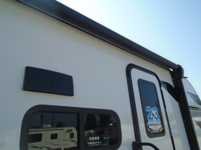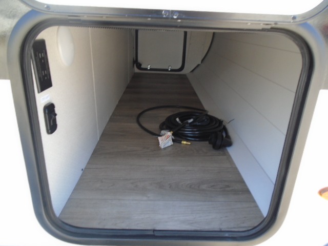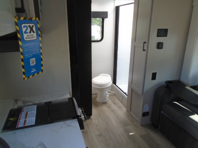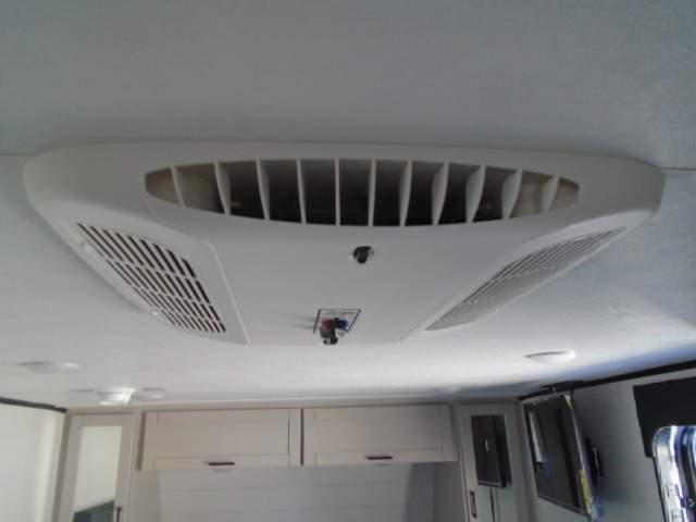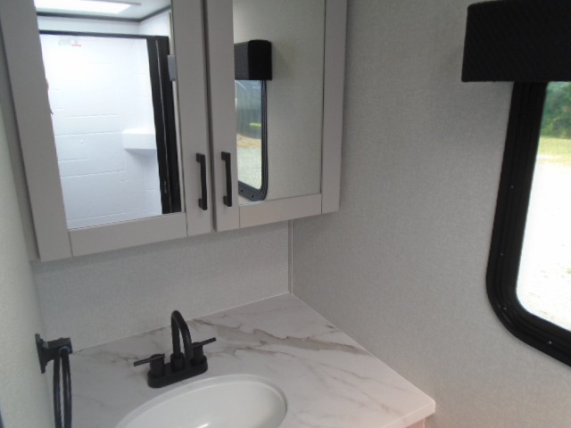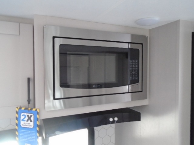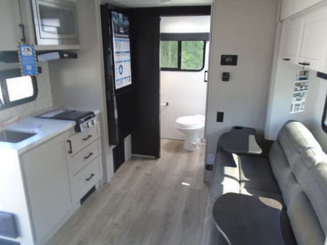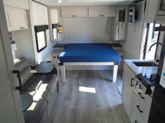This travel trailer will feel just like home with its front RV queen bed, full rear bath, and fully-equipped kitchen! There is a jack-knife sofa slide out where you can relax each day, and there are swivel sofa tables so you can enjoy meals here too. The TV will let you stay in and watch movies if the weather isn't cooperating, or you can grab the fishing gear from the outside storage and weather the storm! You'll also find plenty of interior storage in the multiple overhead cabinets and the bath medicine cabinet!