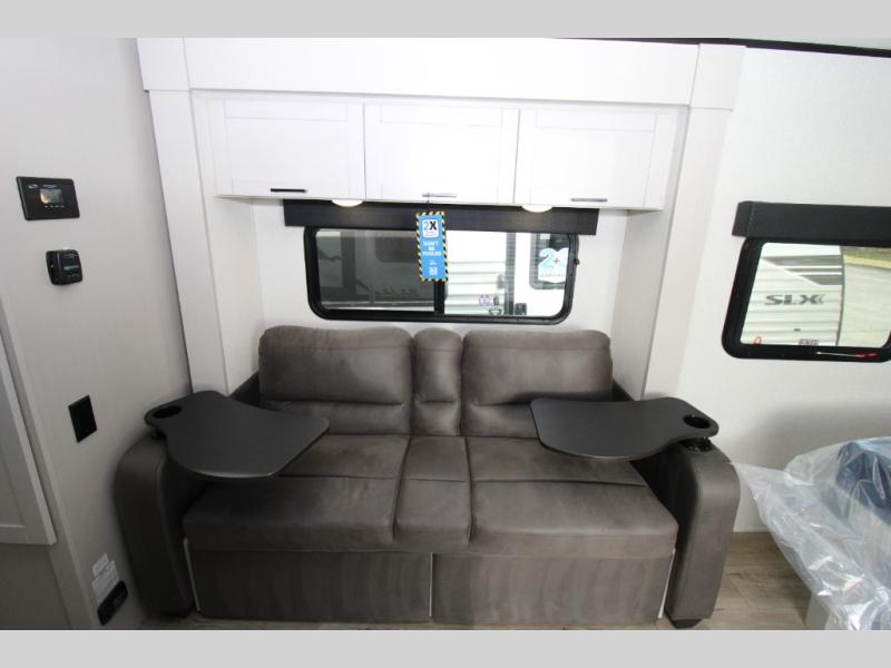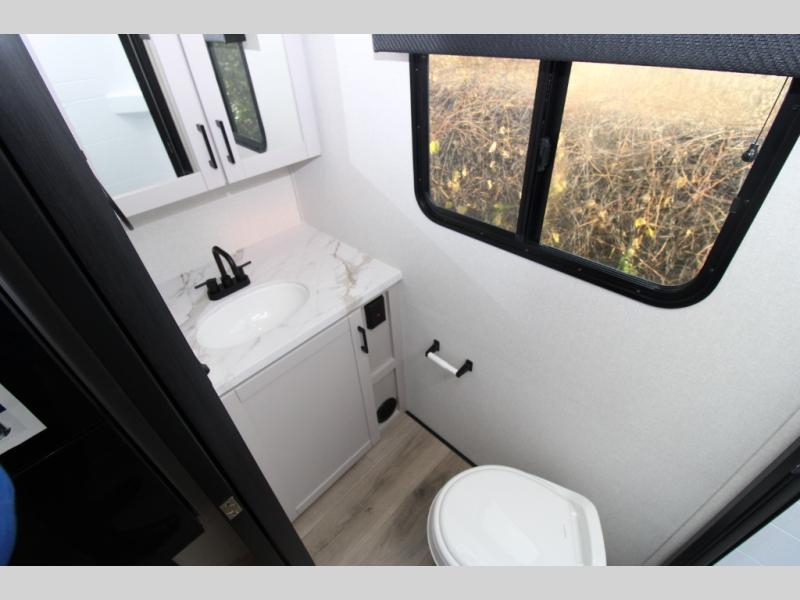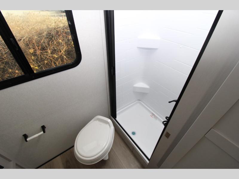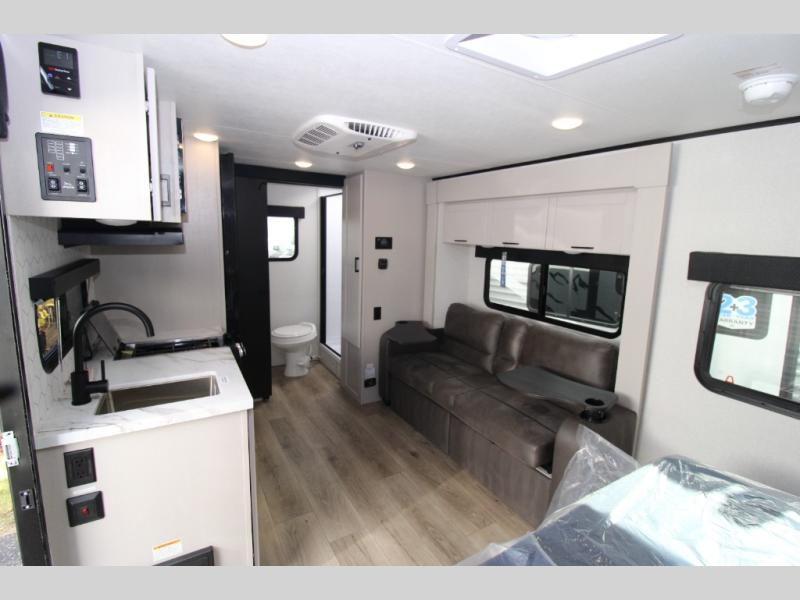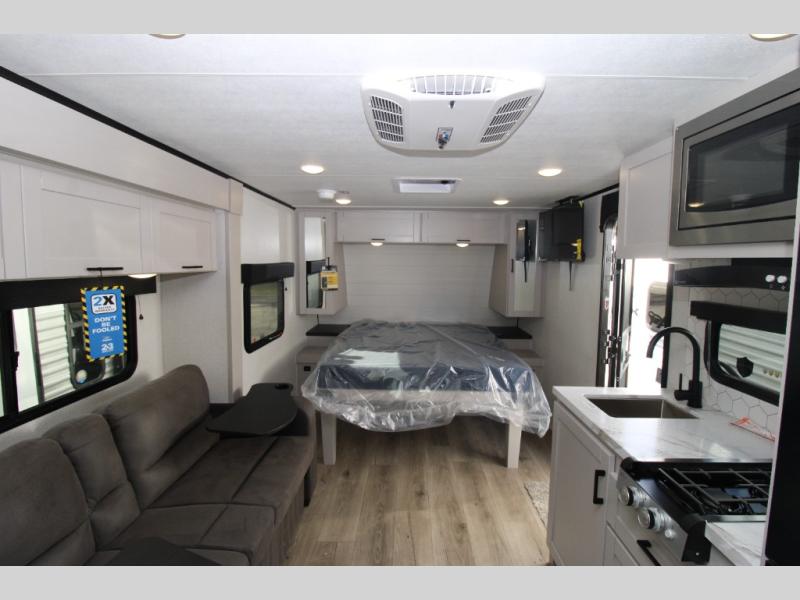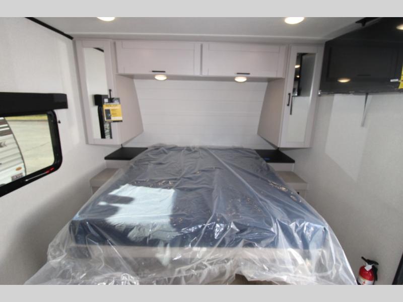 This travel trailer will feel just like home with its front RV queen bed, full rear bath, and fully-equipped kitchen! There is a jack-knife sofa slide out where you can relax each day, and there are swivel sofa tables so you can enjoy meals here too. The TV will let you stay in and watch movies if the weather isn't cooperating, or you can grab the fishing gear from the outside storage and weather the storm! You'll also find plenty of interior storage in the multiple overhead cabinets and the bath medicine cabinet!