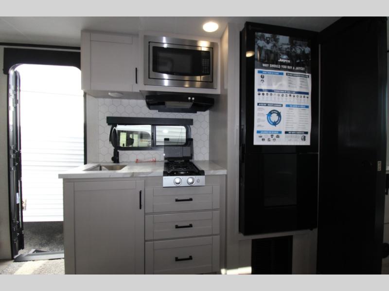 With any Jay Feather Air travel trailer by Jayco, you will enjoy lightweight towing and a variety of features to make each camping trip count! The Climate Shield insulation system helps extend your camping season by keeping you comfortable even in extreme weather conditions, and the Rock Solid stabilizer system means set up will be a breeze. An 18" rear roof ladder lets you easily clean the top of your Magnum Truss roof, and the 2" receiver will be perfect for your bike rack. The Overland 1 Solar Package with a 200W solar panel and 30-amp controller will provide off-grid capabilities, or you can can choose the optional Overland 2 Solar Package with two panels instead! Each Jay Feather Air includes residential-style seamless countertops inside, along with stainless steel sinks, decorative backsplash, and decorative roller shades with a reflective barrier to help keep the sun's rays out.