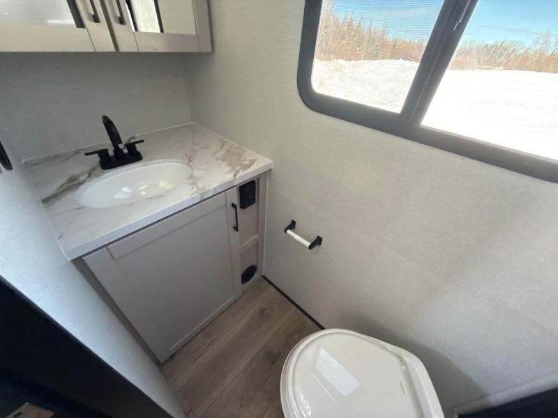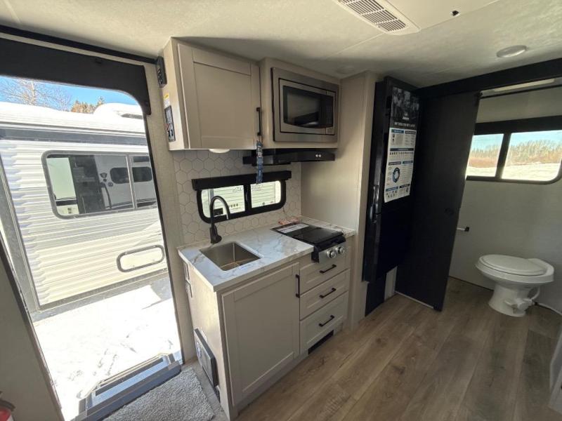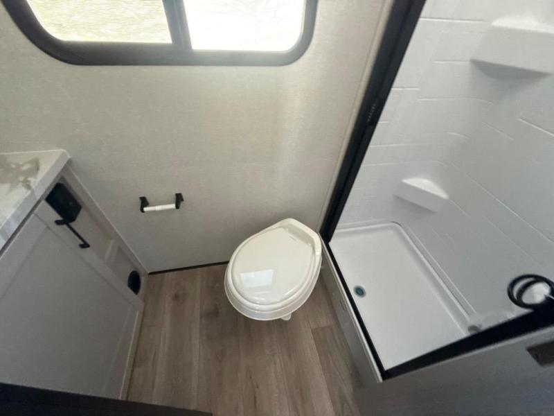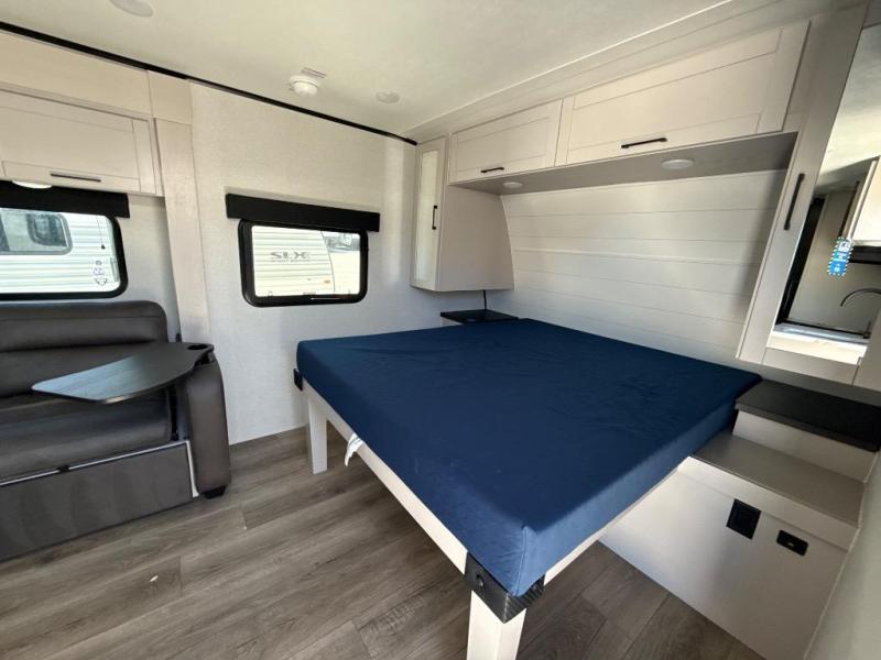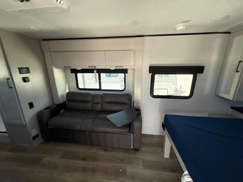 This travel trailer will feel just like home with its front RV queen bed, full rear bath, and fully-equipped kitchen! There is a jack-knife sofa slide out where you can relax each day, and there are swivel sofa tables so you can enjoy meals here too. The TV will let you stay in and watch movies if the weather isn't cooperating, or you can grab the fishing gear from the outside storage and weather the storm! You'll also find plenty of interior storage in the multiple overhead cabinets and the bath medicine cabinet!