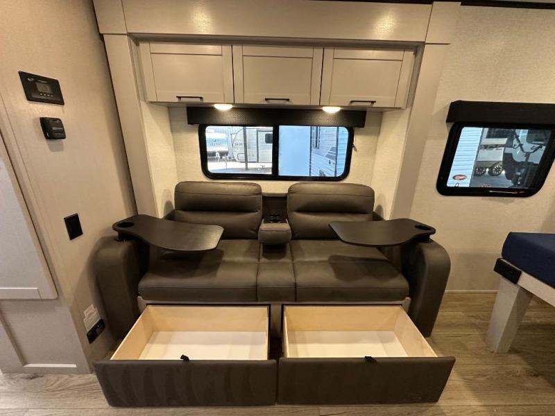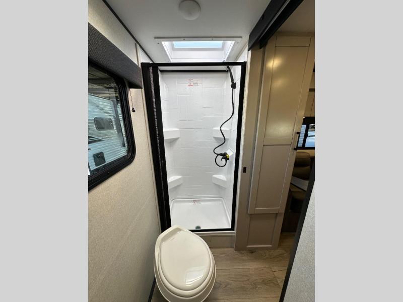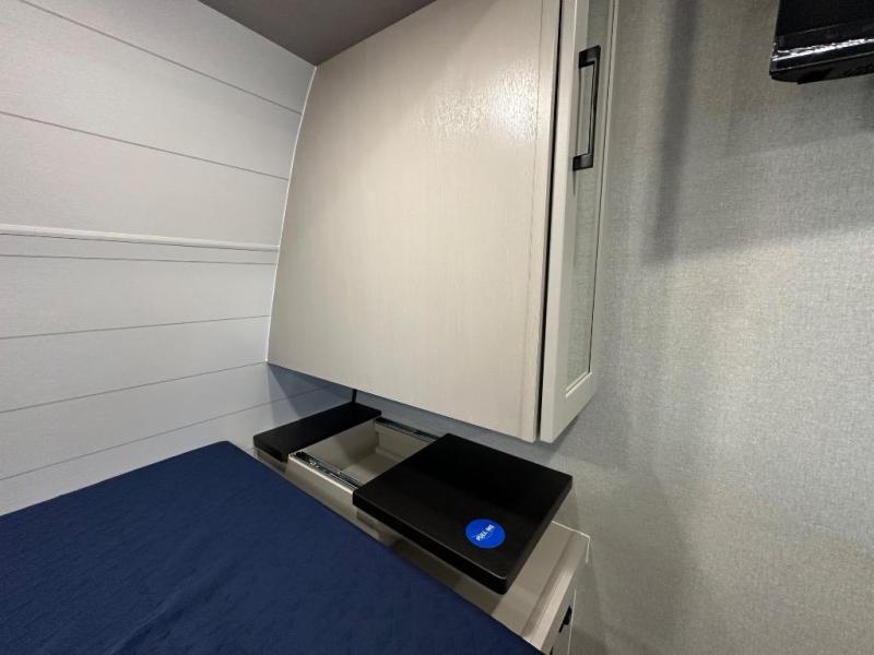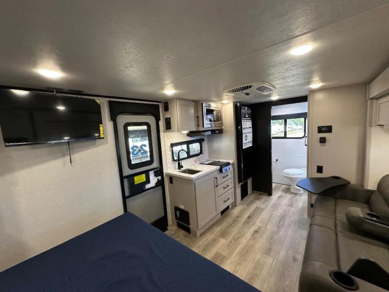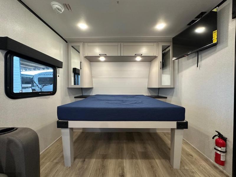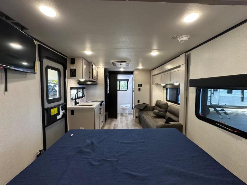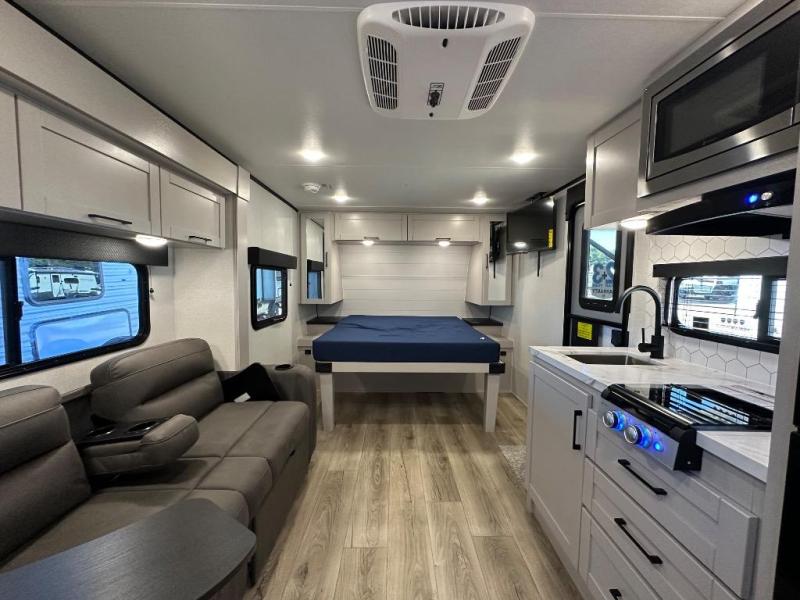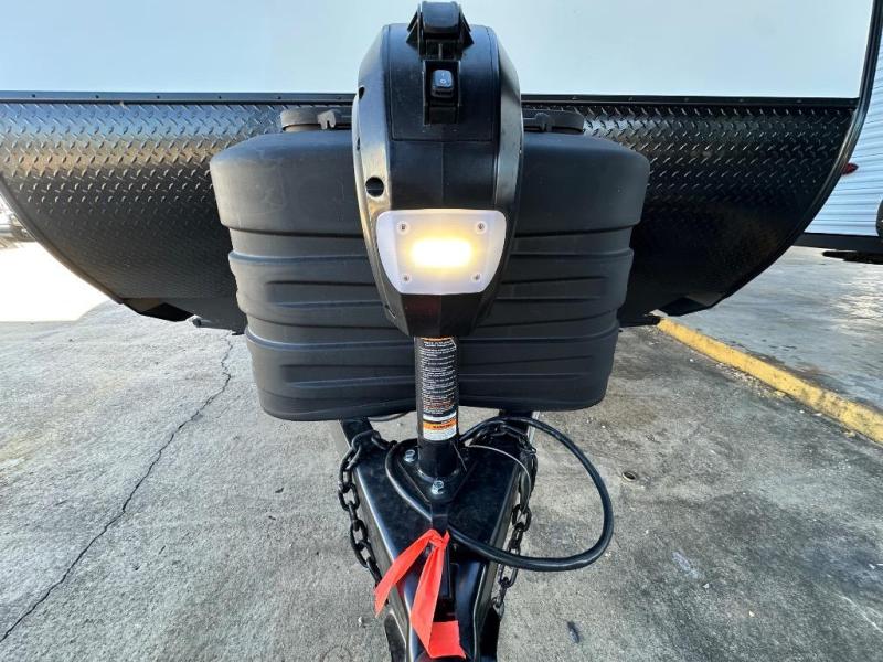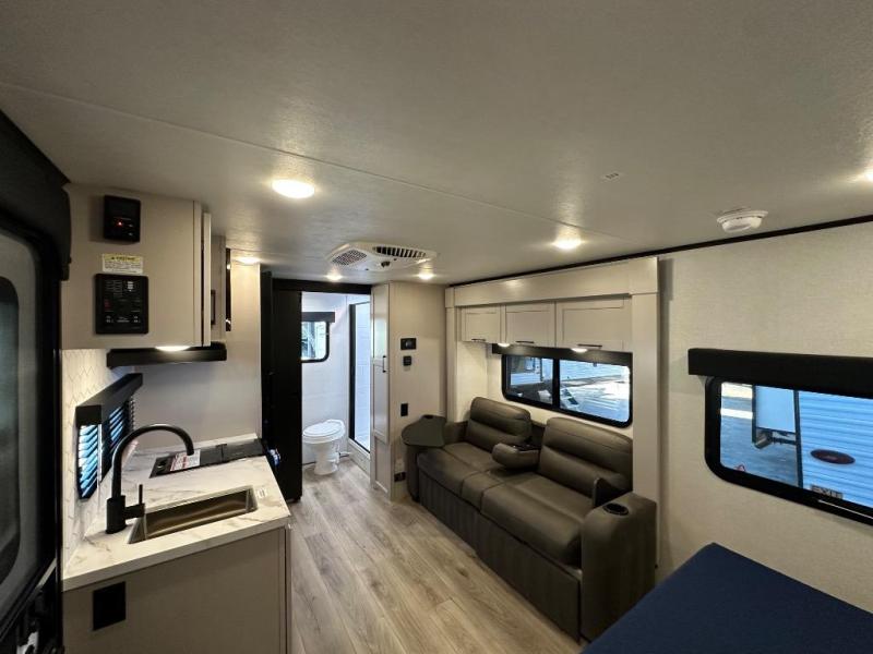 This travel trailer will feel just like home with its front RV queen bed, full rear bath, and fully-equipped kitchen! There is a jack-knife sofa slide out where you can relax each day, and there are swivel sofa tables so you can enjoy meals here too. The TV will let you stay in and watch movies if the weather isn't cooperating, or you can grab the fishing gear from the outside storage and weather the storm! You'll also find plenty of interior storage in the multiple overhead cabinets and the bath medicine cabinet!