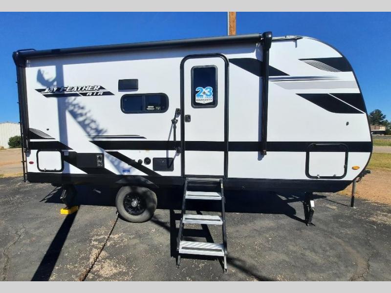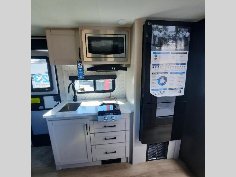 With any Jay Feather Air travel trailer by Jayco, you will enjoy lightweight towing and a variety of features to make each camping trip count! The Climate Shield insulation system helps extend your camping season by keeping you comfortable even in extreme weather conditions, and the Rock Solid stabilizer system means set up will be a breeze. An 18" rear roof ladder lets you easily clean the top of your Magnum Truss roof, and the 2" receiver will be perfect for your bike rack. The Overland 1 Solar Package with a 200W solar panel and 30-amp controller will provide off-grid capabilities, or you can can choose the optional Overland 2 Solar Package with two panels instead! Each Jay Feather Air includes residential-style seamless countertops inside, along with stainless steel sinks, decorative backsplash, and decorative roller shades with a reflective barrier to help keep the sun's rays out.