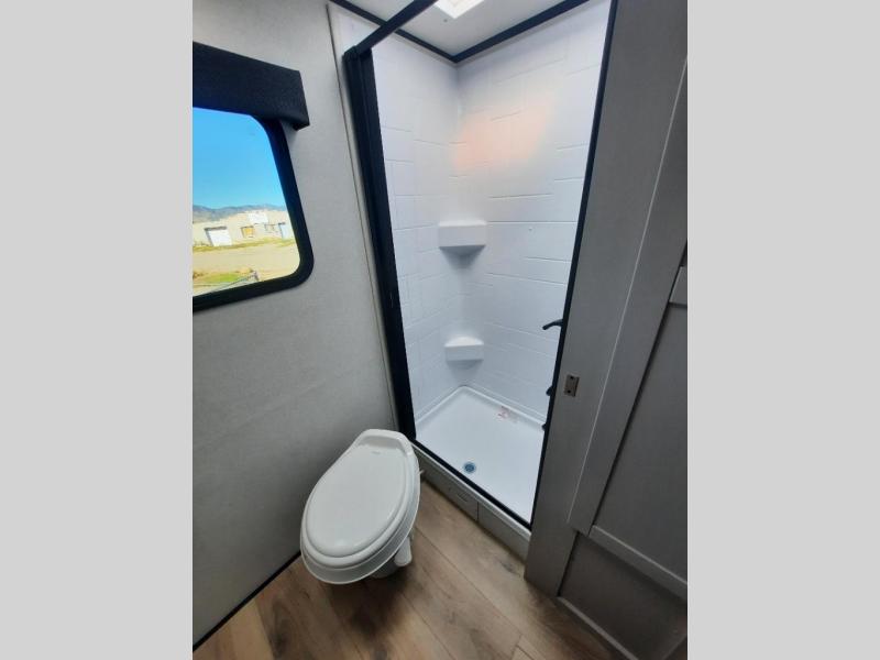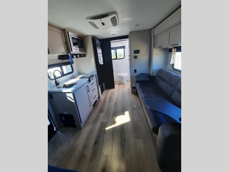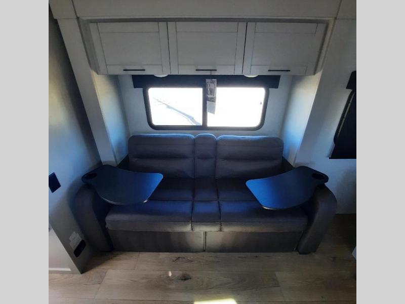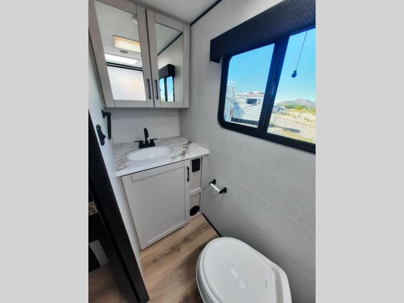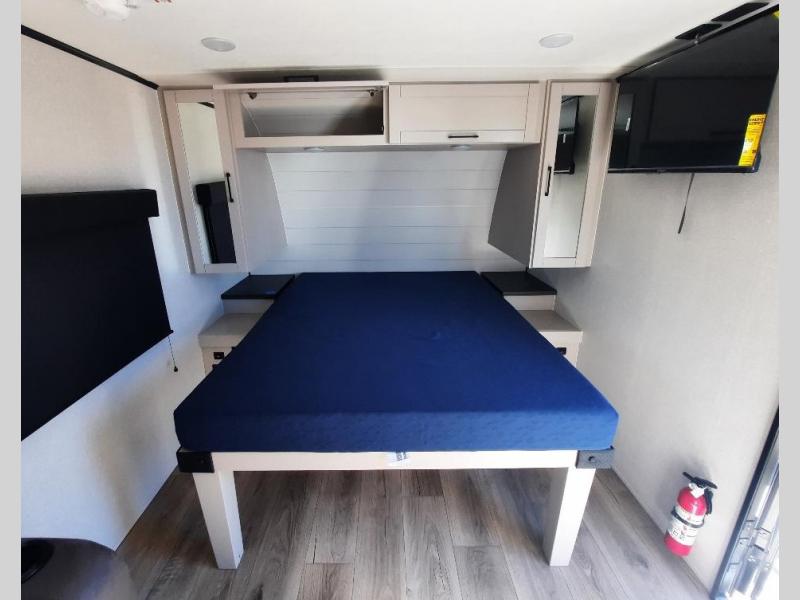 This travel trailer will feel just like home with its front RV queen bed, full rear bath, and fully-equipped kitchen! There is a jack-knife sofa slide out where you can relax each day, and there are swivel sofa tables so you can enjoy meals here too. The TV will let you stay in and watch movies if the weather isn't cooperating, or you can grab the fishing gear from the outside storage and weather the storm! You'll also find plenty of interior storage in the multiple overhead cabinets and the bath medicine cabinet!