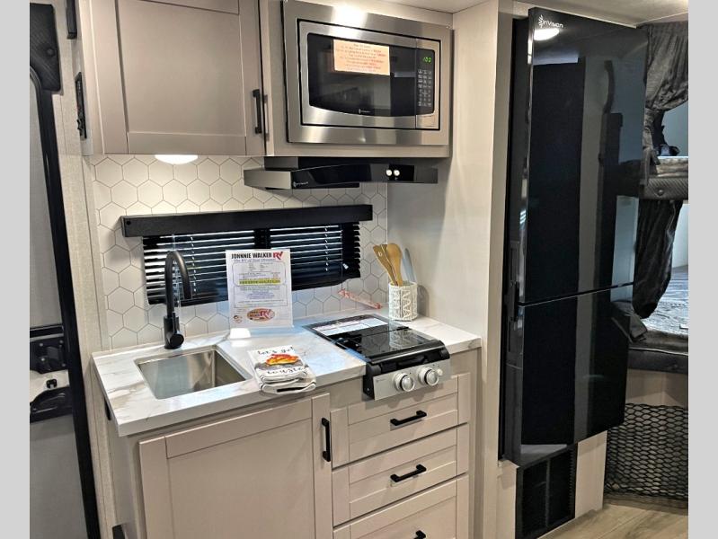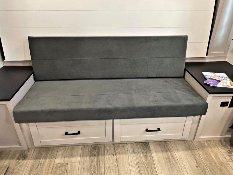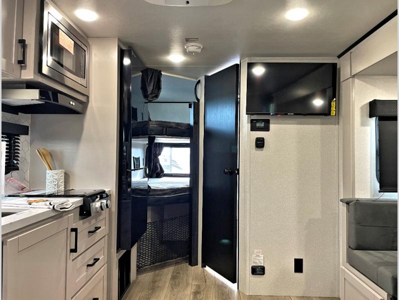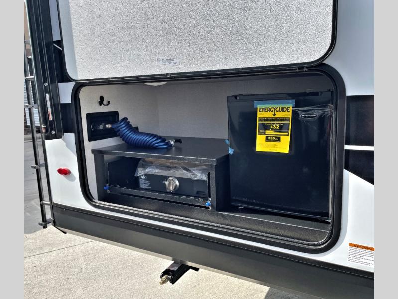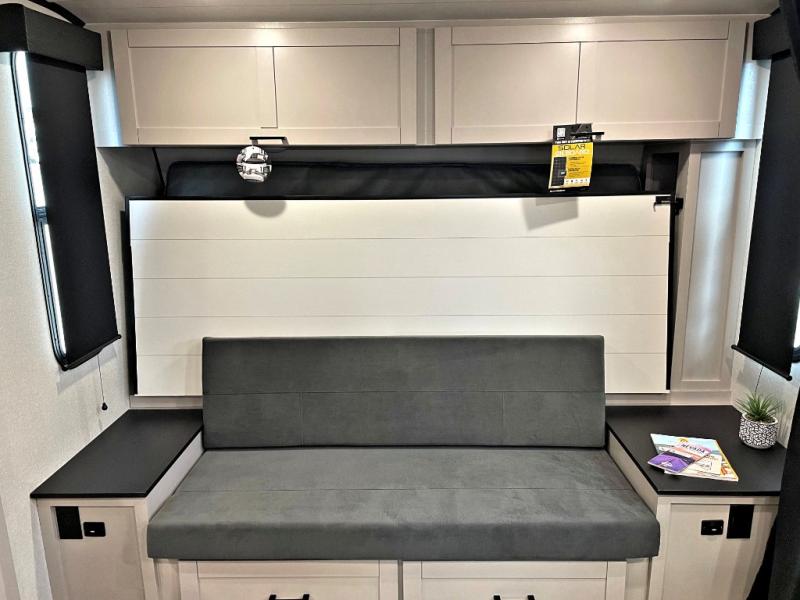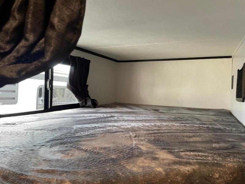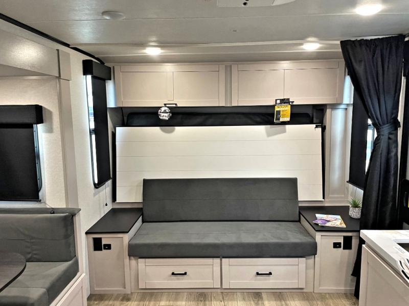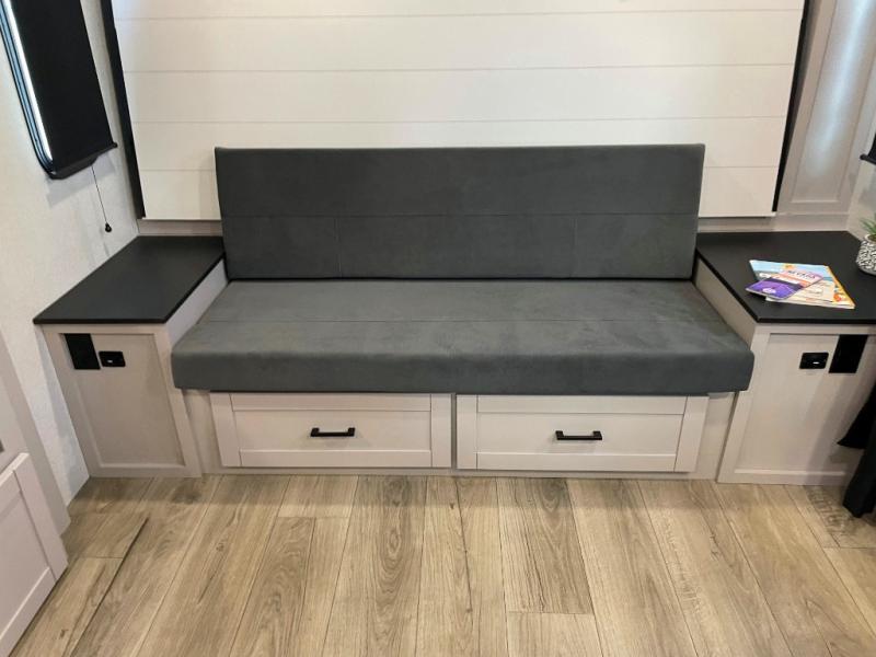 The double-size bunks in this travel trailer mean more friends and family can tag along! Once you arrive at the campground, you can put out the 15' power awning, unload the exterior storage and start lunch on the exterior griddle. A full kitchen indoors will let you make meals here when the weather isn't cooperating. The booth dinette slide will be perfect for meals times, game night, and even additional sleeping space. Up front, you'll find a sofa to relax on during the day and a Murphy bed to sleep on at night; how convenient!