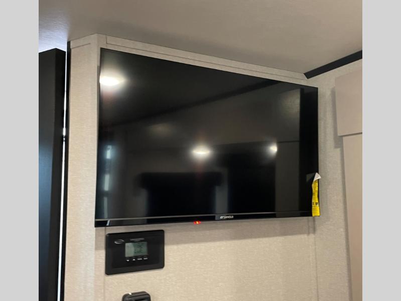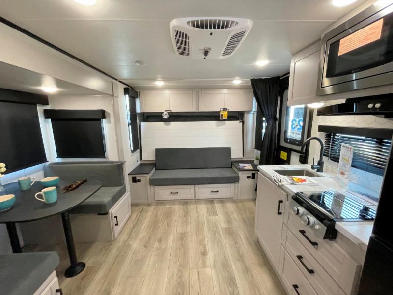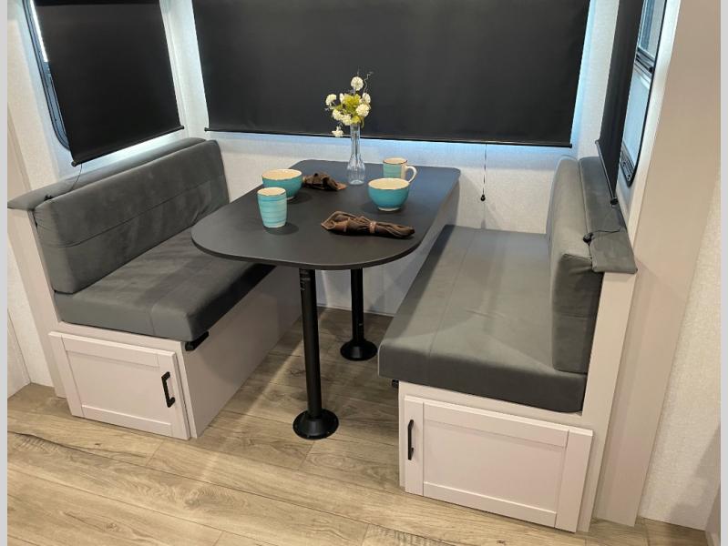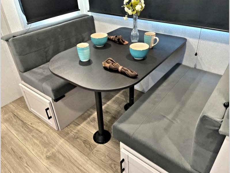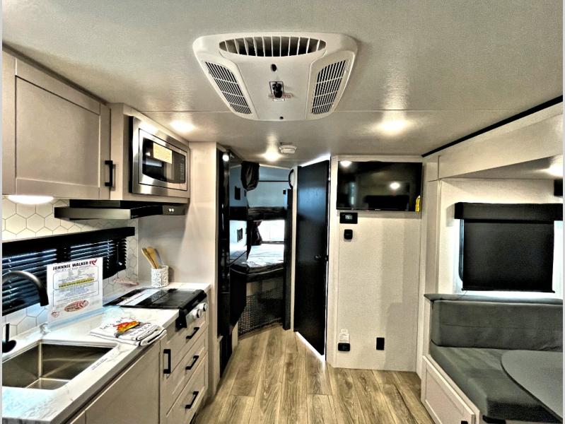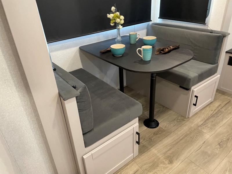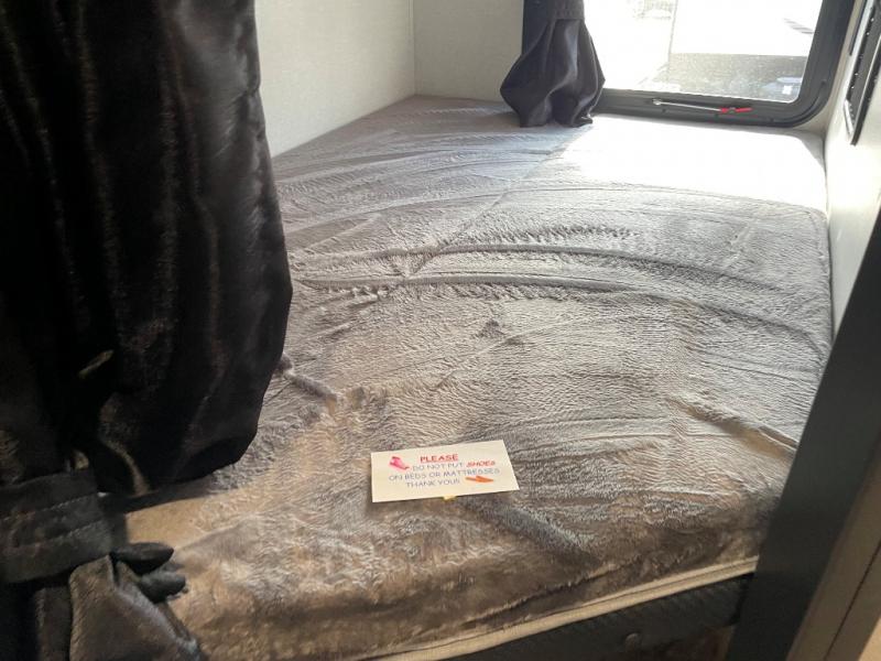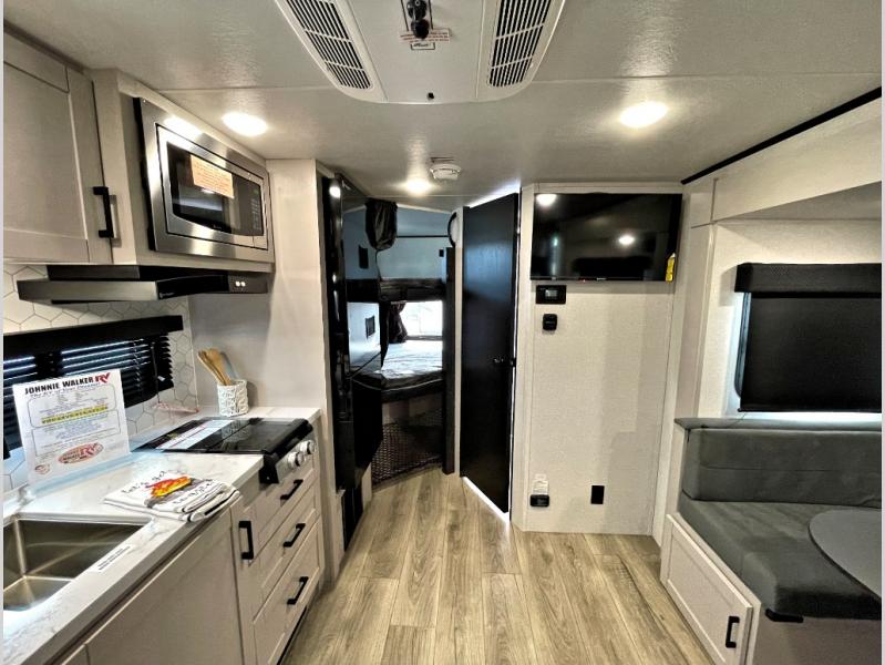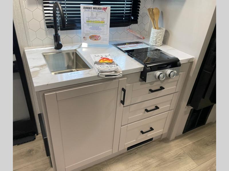 The double-size bunks in this travel trailer mean more friends and family can tag along! Once you arrive at the campground, you can put out the 15' power awning, unload the exterior storage and start lunch on the exterior griddle. A full kitchen indoors will let you make meals here when the weather isn't cooperating. The booth dinette slide will be perfect for meals times, game night, and even additional sleeping space. Up front, you'll find a sofa to relax on during the day and a Murphy bed to sleep on at night; how convenient!