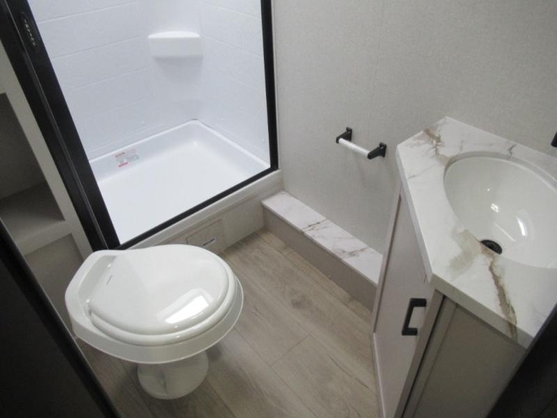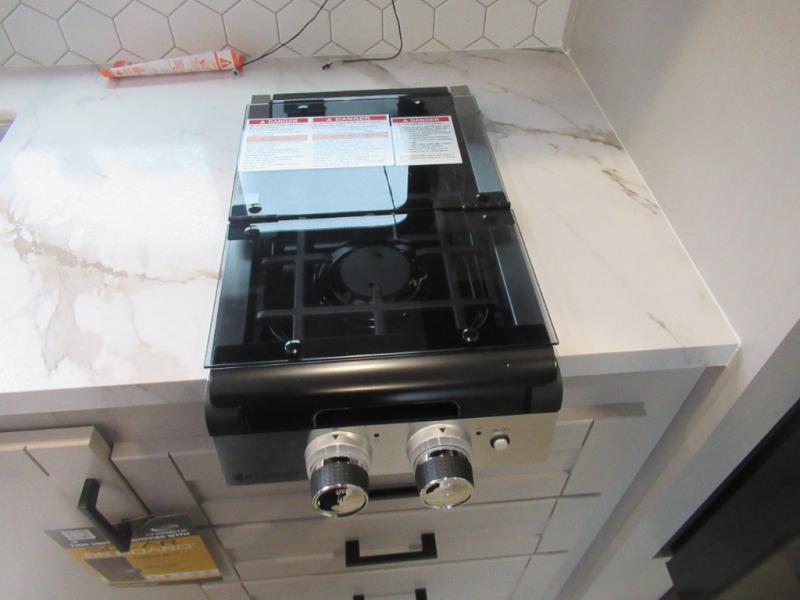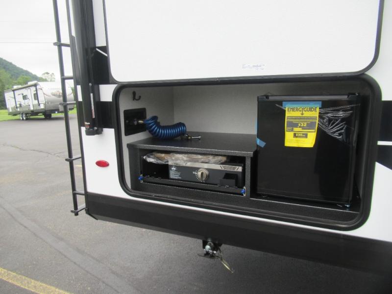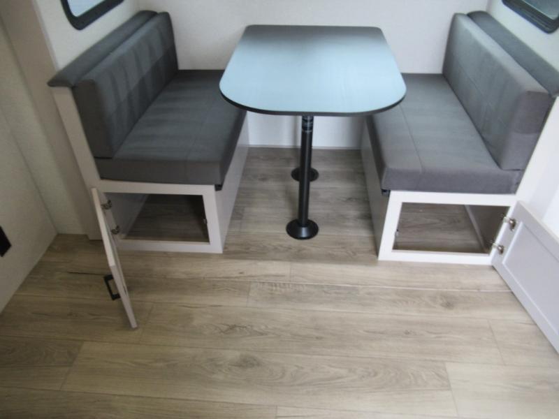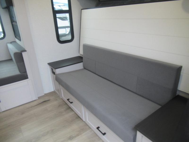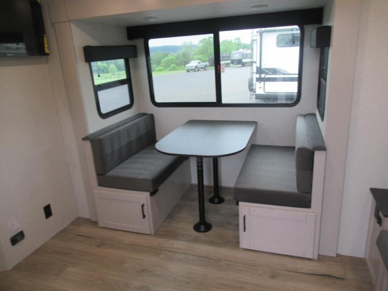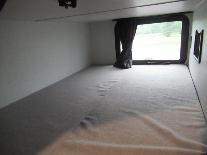 The double-size bunks in this travel trailer mean more friends and family can tag along! Once you arrive at the campground, you can put out the 15' power awning, unload the exterior storage and start lunch on the exterior griddle. A full kitchen indoors will let you make meals here when the weather isn't cooperating. The booth dinette slide will be perfect for meals times, game night, and even additional sleeping space. Up front, you'll find a sofa to relax on during the day and a Murphy bed to sleep on at night; how convenient!