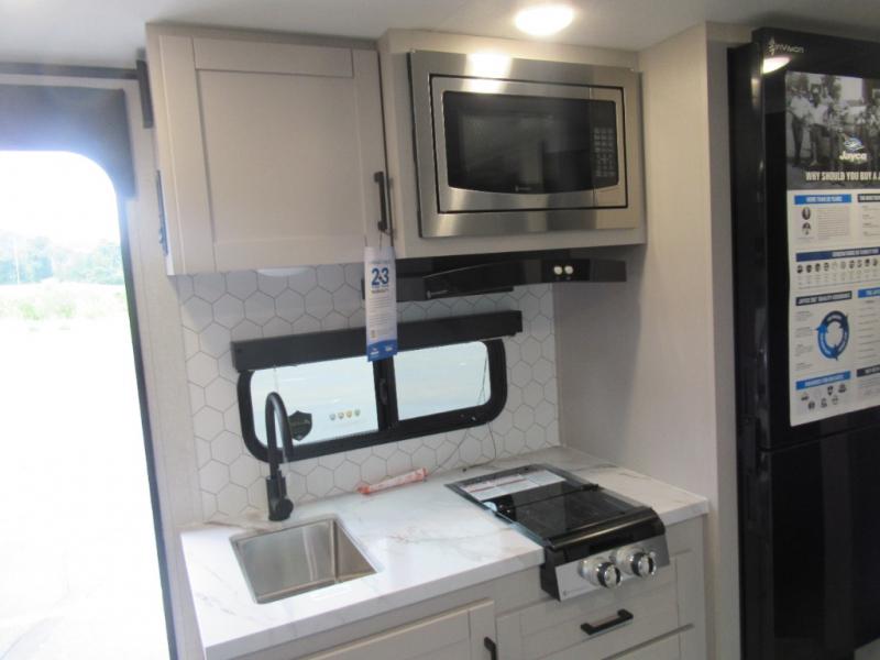 With any Jay Feather Air travel trailer by Jayco, you will enjoy lightweight towing and a variety of features to make each camping trip count! The Climate Shield insulation system helps extend your camping season by keeping you comfortable even in extreme weather conditions, and the Rock Solid stabilizer system means set up will be a breeze. An 18" rear roof ladder lets you easily clean the top of your Magnum Truss roof, and the 2" receiver will be perfect for your bike rack. The Overland 1 Solar Package with a 200W solar panel and 30-amp controller will provide off-grid capabilities, or you can can choose the optional Overland 2 Solar Package with two panels instead! Each Jay Feather Air includes residential-style seamless countertops inside, along with stainless steel sinks, decorative backsplash, and decorative roller shades with a reflective barrier to help keep the sun's rays out.