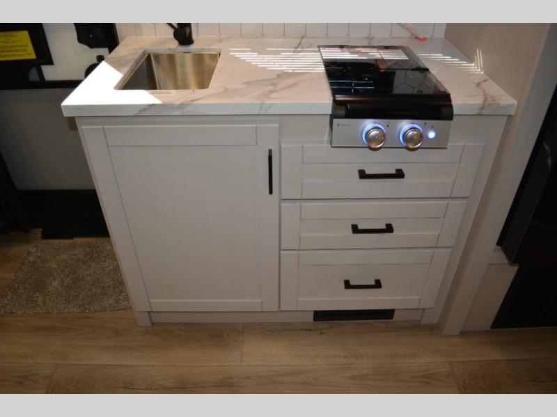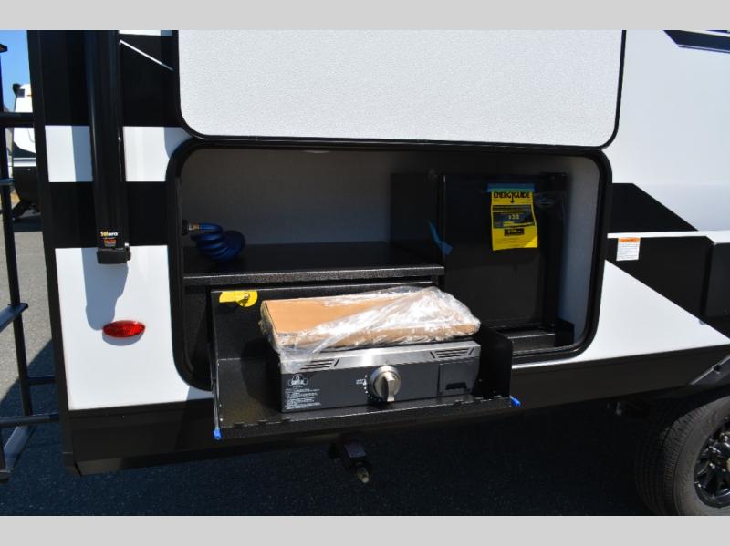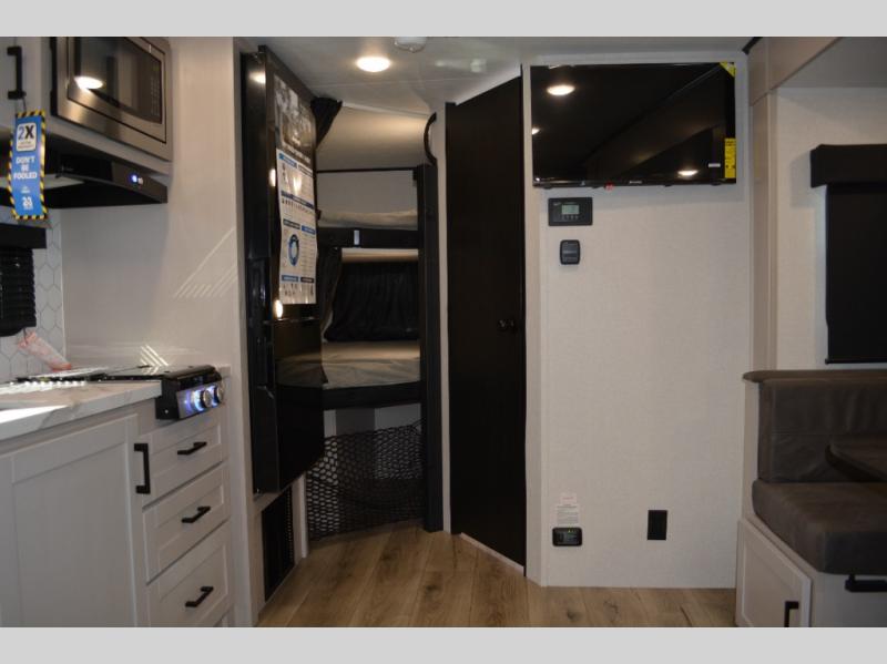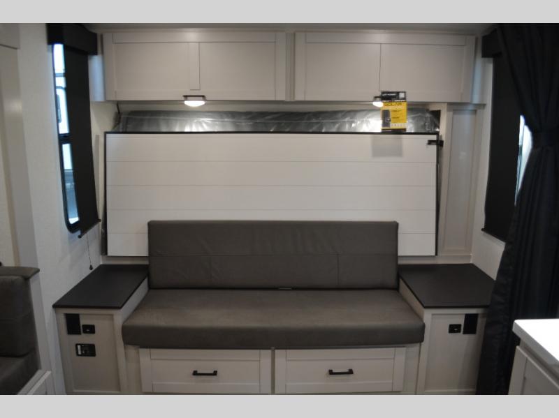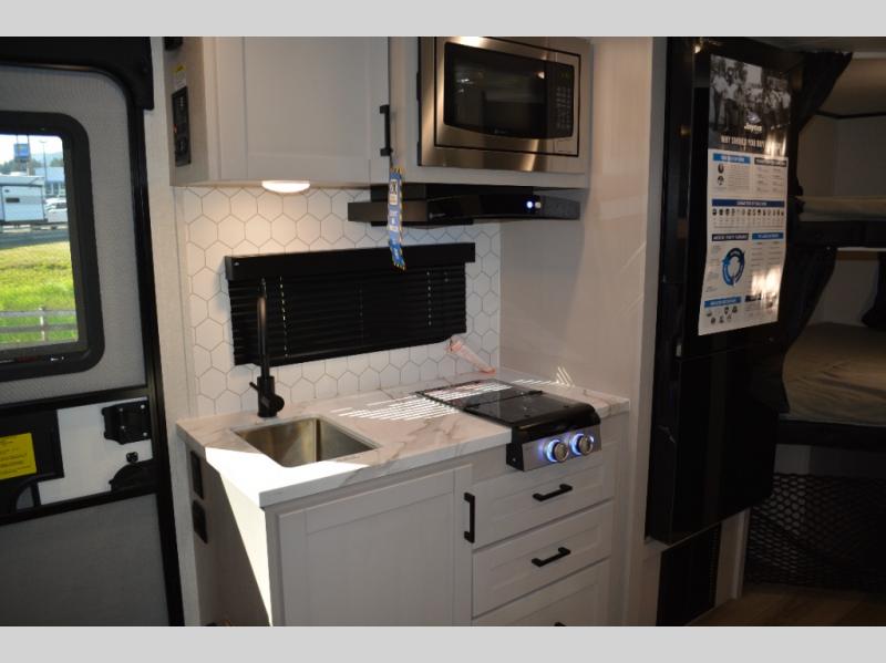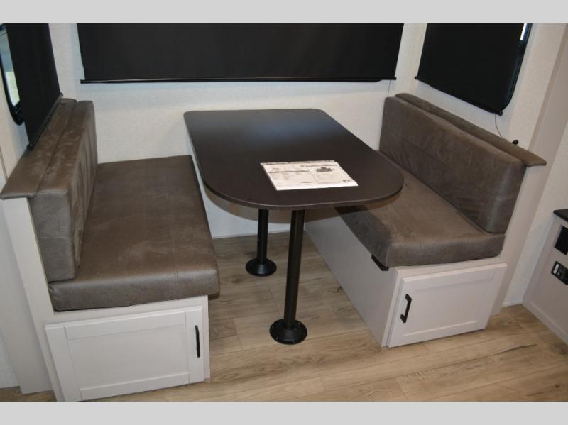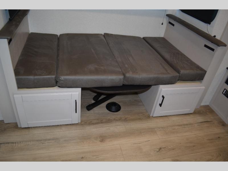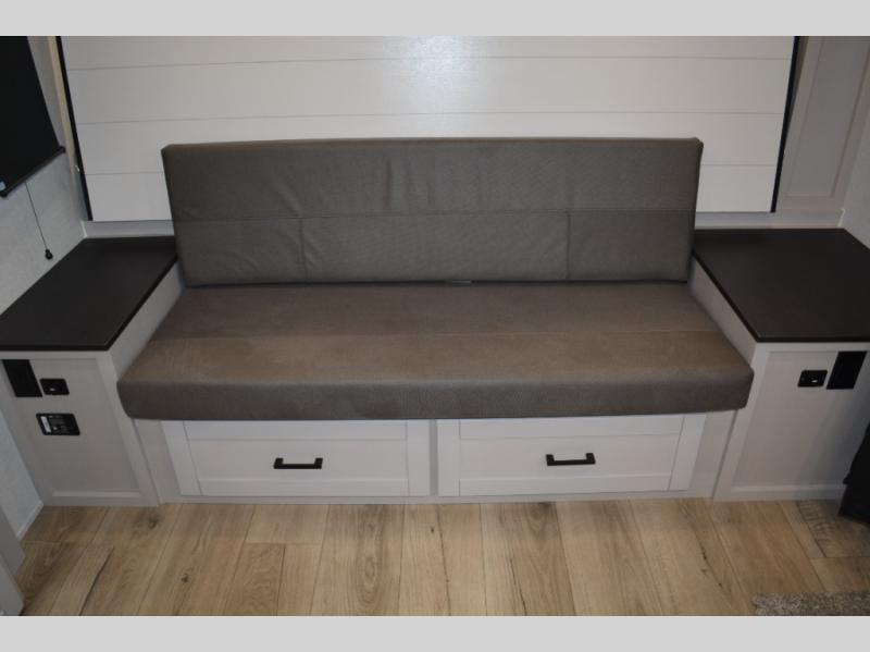 The double-size bunks in this travel trailer mean more friends and family can tag along! Once you arrive at the campground, you can put out the 15' power awning, unload the exterior storage and start lunch on the exterior griddle. A full kitchen indoors will let you make meals here when the weather isn't cooperating. The booth dinette slide will be perfect for meals times, game night, and even additional sleeping space. Up front, you'll find a sofa to relax on during the day and a Murphy bed to sleep on at night; how convenient!