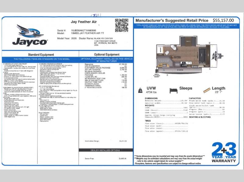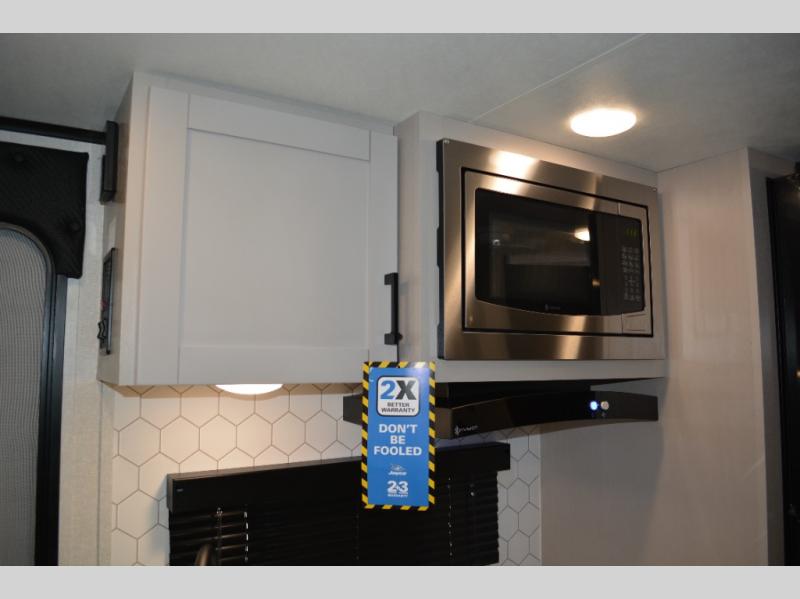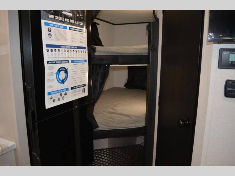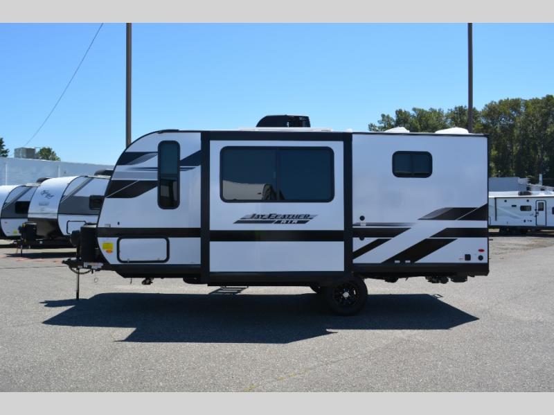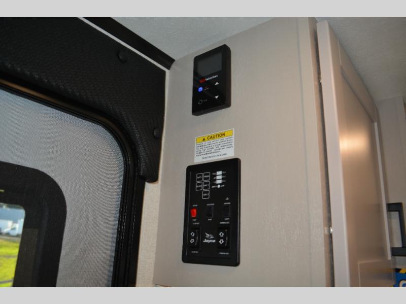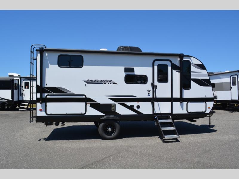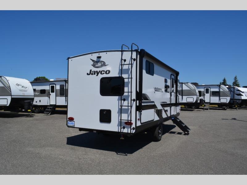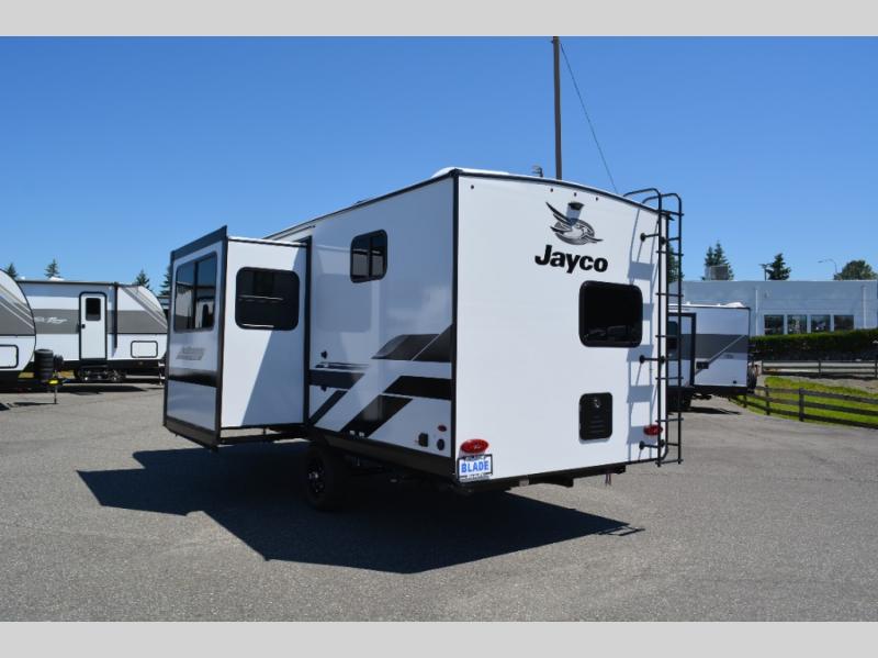 With any Jay Feather Air travel trailer by Jayco, you will enjoy lightweight towing and a variety of features to make each camping trip count! The Climate Shield insulation system helps extend your camping season by keeping you comfortable even in extreme weather conditions, and the Rock Solid stabilizer system means set up will be a breeze. An 18" rear roof ladder lets you easily clean the top of your Magnum Truss roof, and the 2" receiver will be perfect for your bike rack. The Overland 1 Solar Package with a 200W solar panel and 30-amp controller will provide off-grid capabilities, or you can can choose the optional Overland 2 Solar Package with two panels instead! Each Jay Feather Air includes residential-style seamless countertops inside, along with stainless steel sinks, decorative backsplash, and decorative roller shades with a reflective barrier to help keep the sun's rays out.