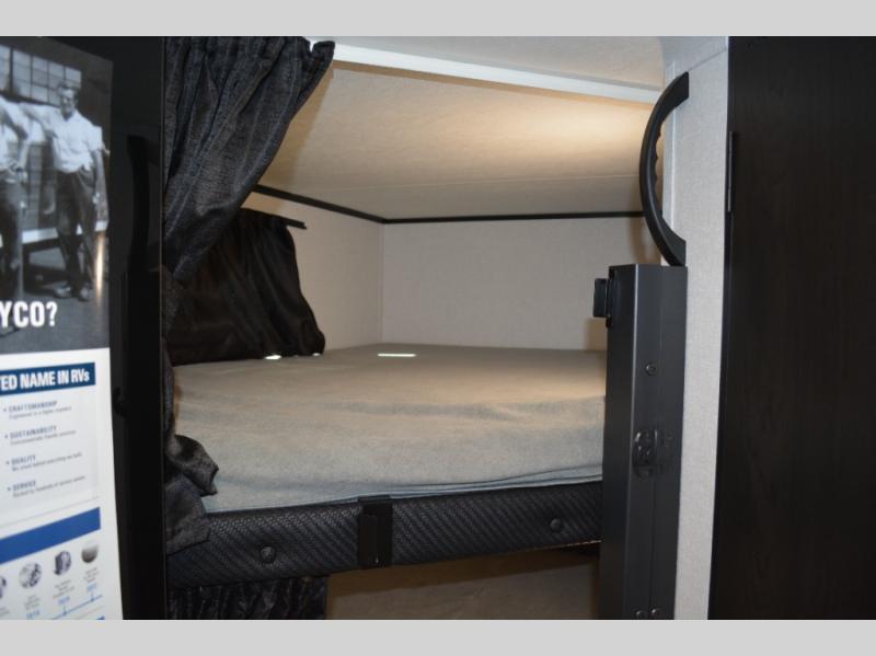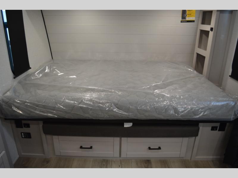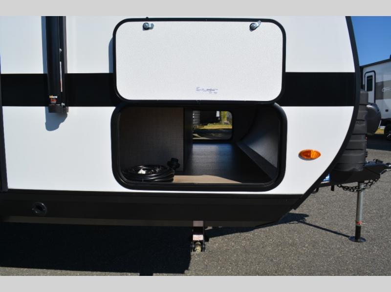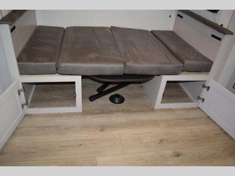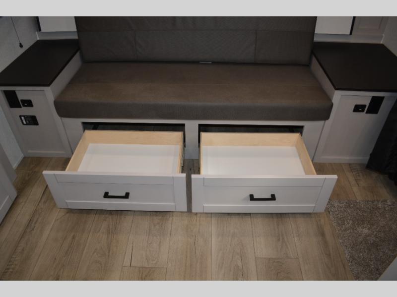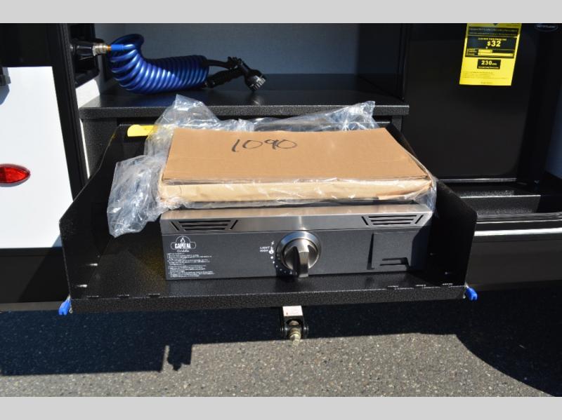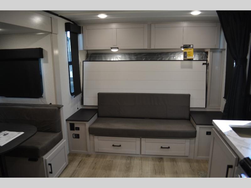 The double-size bunks in this travel trailer mean more friends and family can tag along! Once you arrive at the campground, you can put out the 15' power awning, unload the exterior storage and start lunch on the exterior griddle. A full kitchen indoors will let you make meals here when the weather isn't cooperating. The booth dinette slide will be perfect for meals times, game night, and even additional sleeping space. Up front, you'll find a sofa to relax on during the day and a Murphy bed to sleep on at night; how convenient!