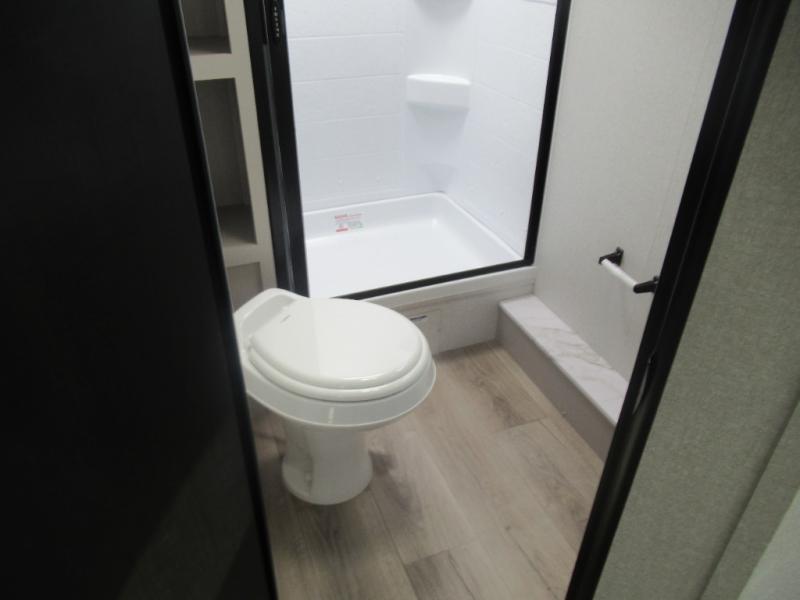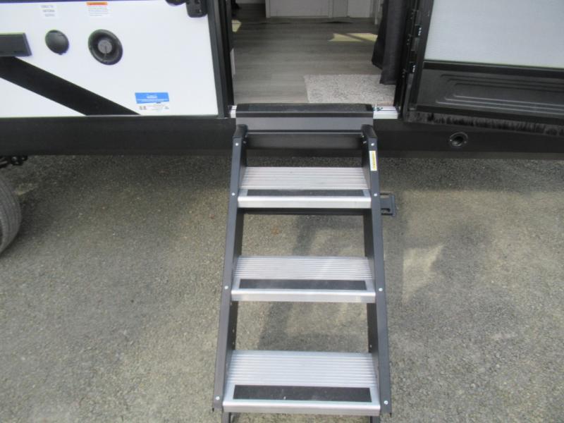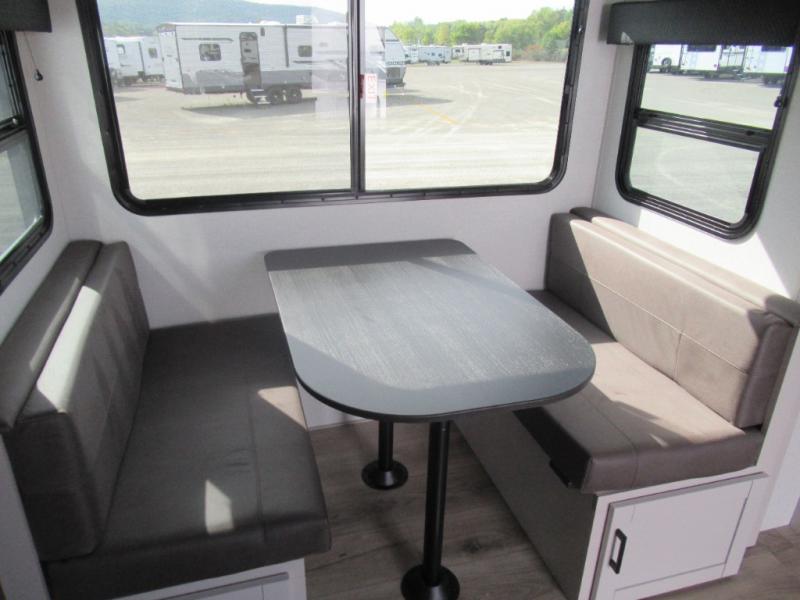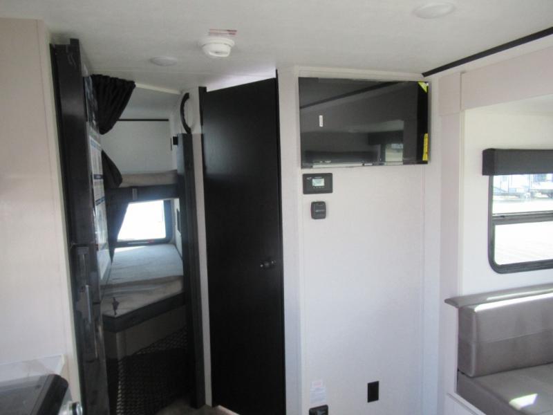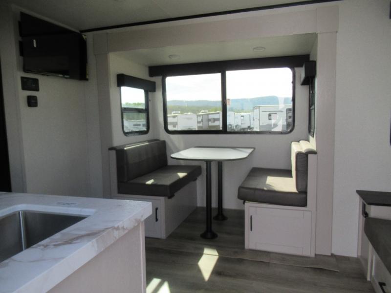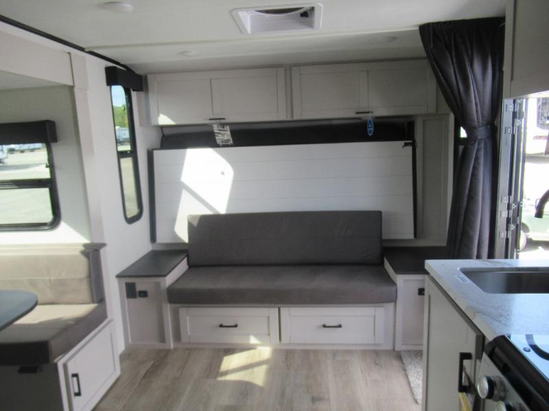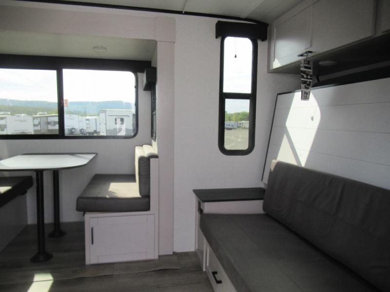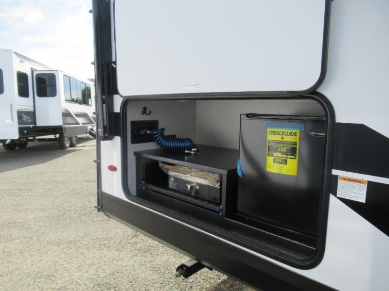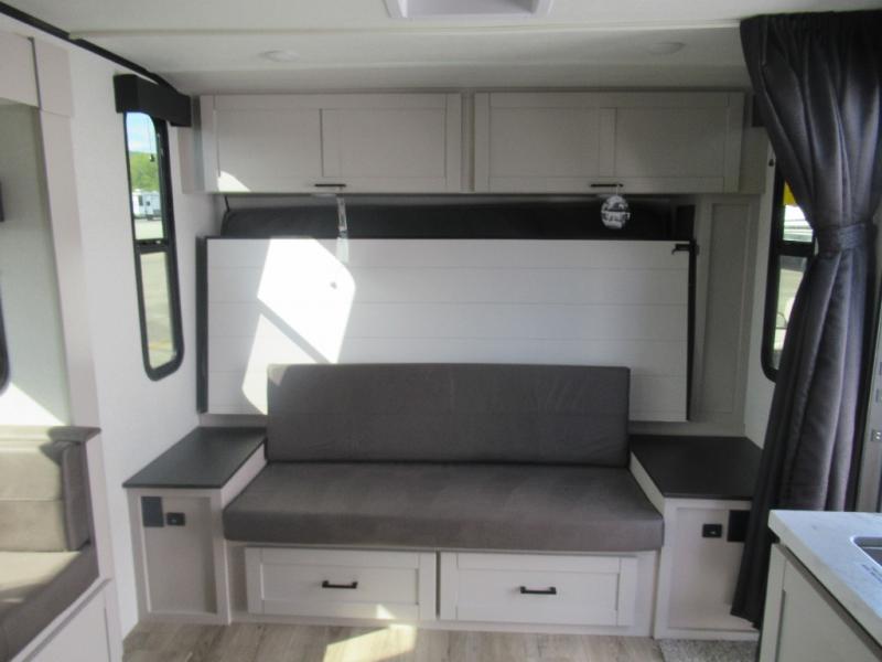 The double-size bunks in this travel trailer mean more friends and family can tag along! Once you arrive at the campground, you can put out the 15' power awning, unload the exterior storage and start lunch on the exterior griddle. A full kitchen indoors will let you make meals here when the weather isn't cooperating. The booth dinette slide will be perfect for meals times, game night, and even additional sleeping space. Up front, you'll find a sofa to relax on during the day and a Murphy bed to sleep on at night; how convenient!