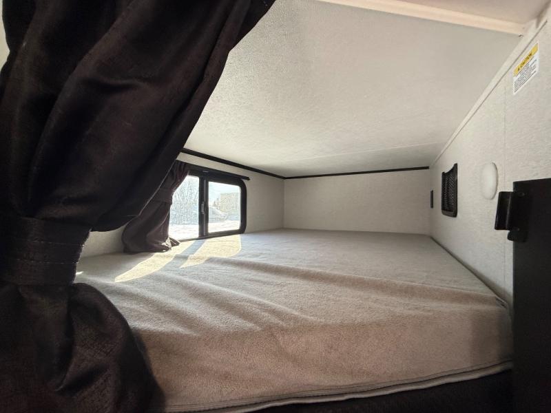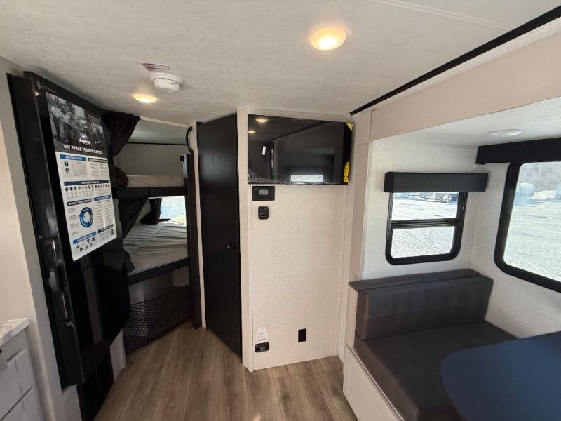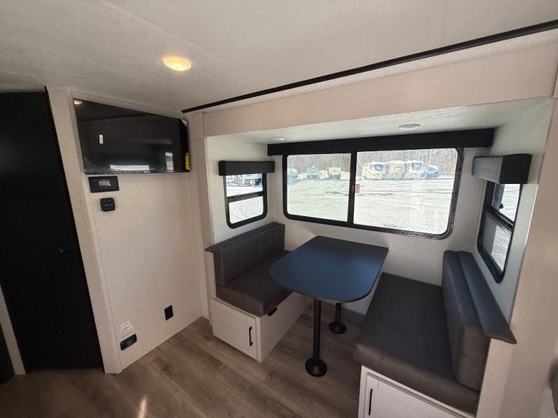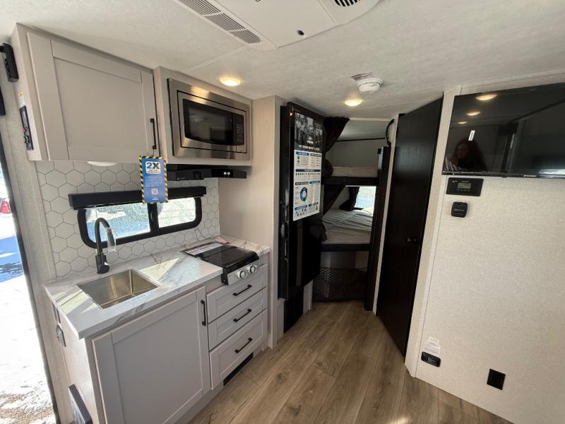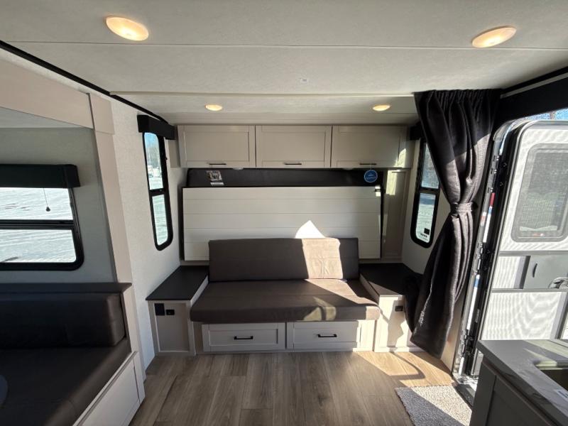 The double-size bunks in this travel trailer mean more friends and family can tag along! Once you arrive at the campground, you can put out the 15' power awning, unload the exterior storage and start lunch on the exterior griddle. A full kitchen indoors will let you make meals here when the weather isn't cooperating. The booth dinette slide will be perfect for meals times, game night, and even additional sleeping space. Up front, you'll find a sofa to relax on during the day and a Murphy bed to sleep on at night; how convenient!