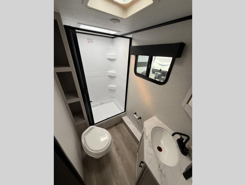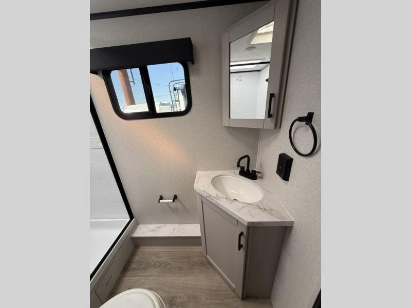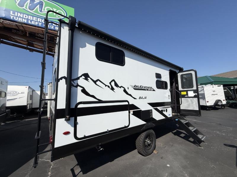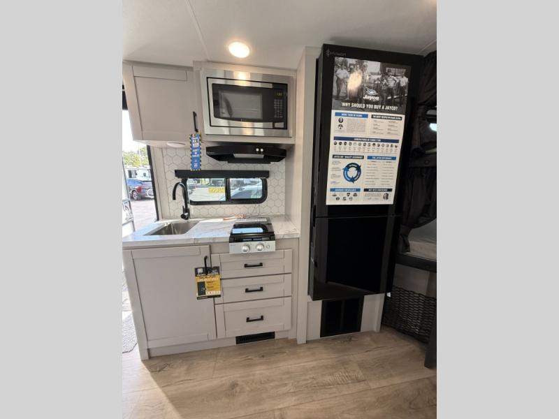 With any Jay Feather Air travel trailer by Jayco, you will enjoy lightweight towing and a variety of features to make each camping trip count! The Climate Shield insulation system helps extend your camping season by keeping you comfortable even in extreme weather conditions, and the Rock Solid stabilizer system means set up will be a breeze. An 18" rear roof ladder lets you easily clean the top of your Magnum Truss roof, and the 2" receiver will be perfect for your bike rack. The Overland 1 Solar Package with a 200W solar panel and 30-amp controller will provide off-grid capabilities, or you can can choose the optional Overland 2 Solar Package with two panels instead! Each Jay Feather Air includes residential-style seamless countertops inside, along with stainless steel sinks, decorative backsplash, and decorative roller shades with a reflective barrier to help keep the sun's rays out.