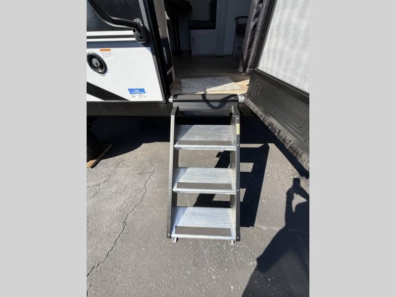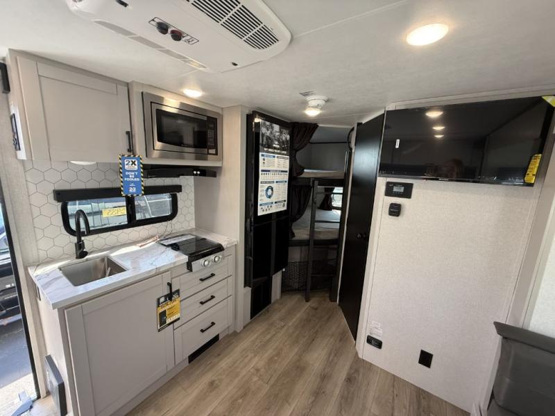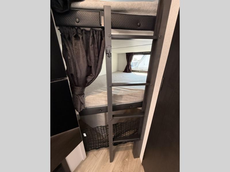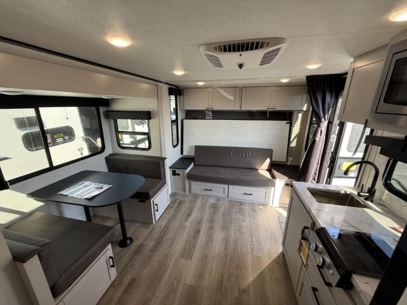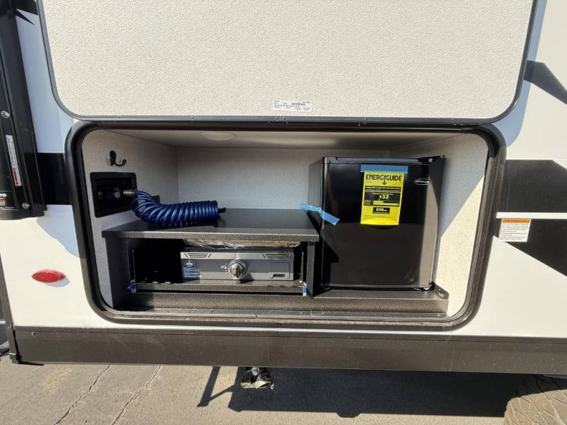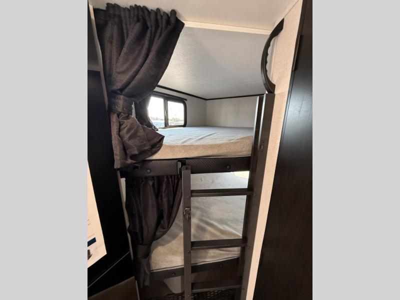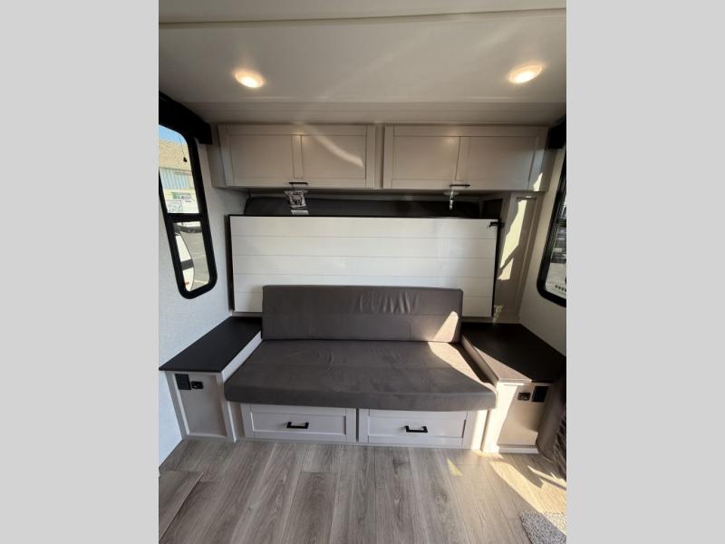 The double-size bunks in this travel trailer mean more friends and family can tag along! Once you arrive at the campground, you can put out the 15' power awning, unload the exterior storage and start lunch on the exterior griddle. A full kitchen indoors will let you make meals here when the weather isn't cooperating. The booth dinette slide will be perfect for meals times, game night, and even additional sleeping space. Up front, you'll find a sofa to relax on during the day and a Murphy bed to sleep on at night; how convenient!