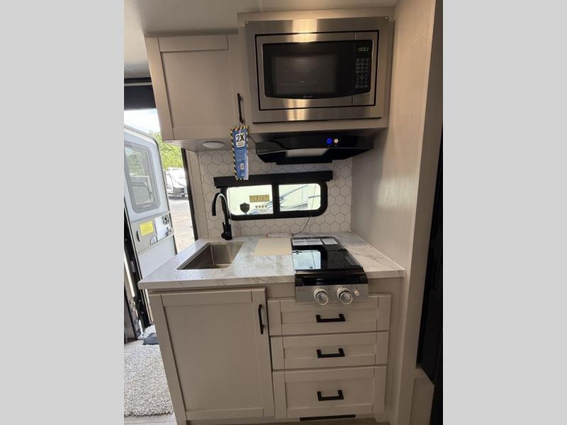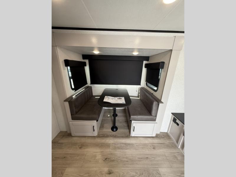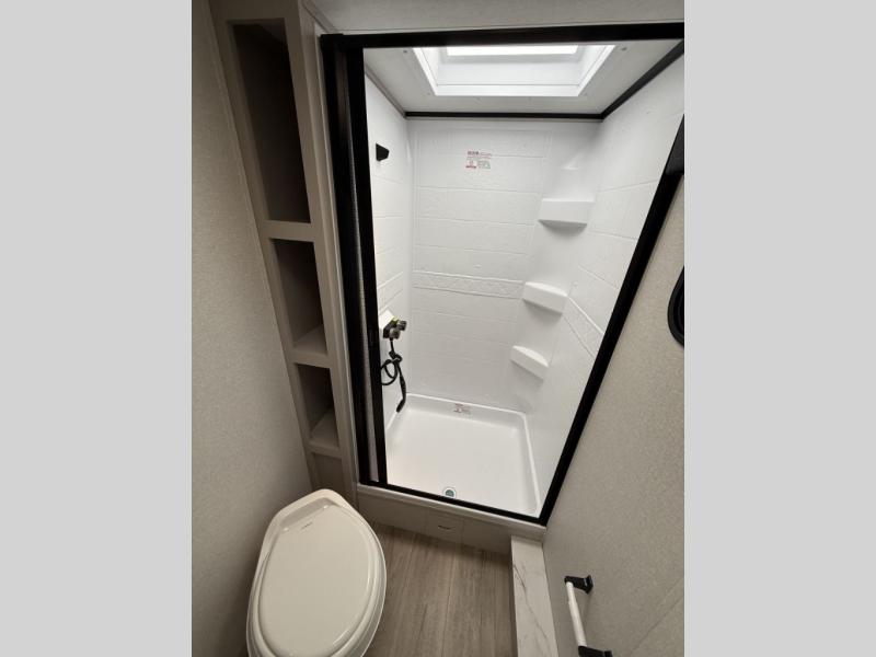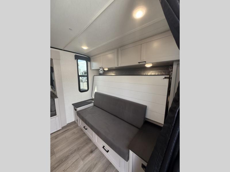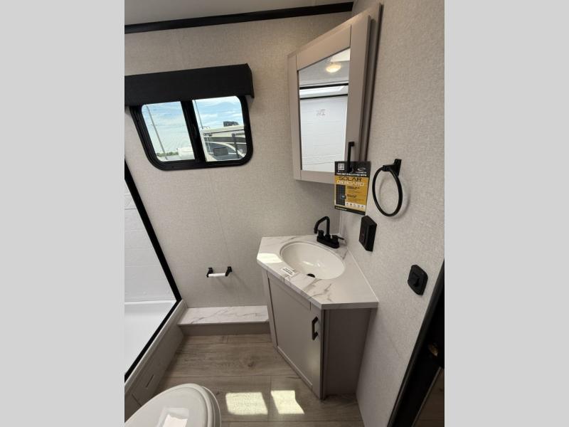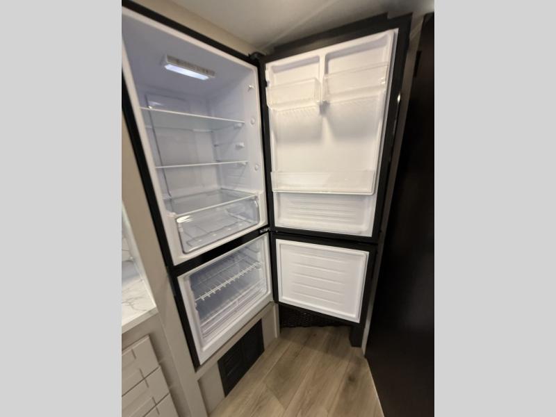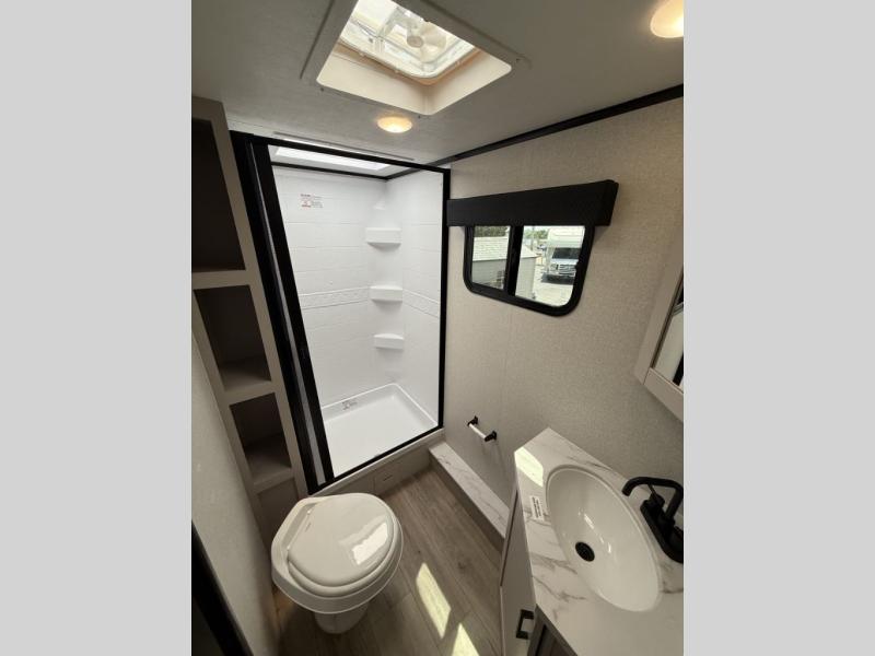The cabinet doors and drawers are oversized, increasing storage space and maximizing the overall use of space. Hidden hinges and a seamless countertop in the kitchen add to the luxurious, residential feel. The InVision Suite appliance package comes standard and includes an 11 cu. ft. 12V fridge, which is five cubic feet larger than other brands. The kitchen in this lightweight Travel Trailer also features a stainless-steel sink. In the bathroom, you’ll find high-rise gooseneck faucets and a new roller-style shower enclosure, that opens up the space even more.