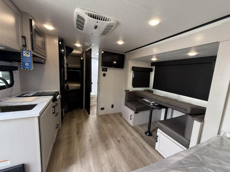 Additionally, this Travel Trailer comes standard with large, ventilated windows and standard 14-inch power roof vents in the bathroom for additional airflow and ventilation. These systems work together to ensure that you remain cool and comfortable, even on the hottest days. The Jayco Feather Air has some amazing features that set it apart from its competitors. First, the 60,000 BTU tankless water heater and 55-gallon freshwater tank provide an endless supply of hot water. The Jayco Feather Air also has an optional Rock-Solid Stabilizer System. This system is easy to use, and it creates a solid camping experience. Another factor in durability and comfort, is the plywood bed, bunk, dinette, and shower bases, which are all reinforced. The single-over-single bunks can hold 300 lbs. each, and the double-over-double bunks can hold 600 lbs. each.
