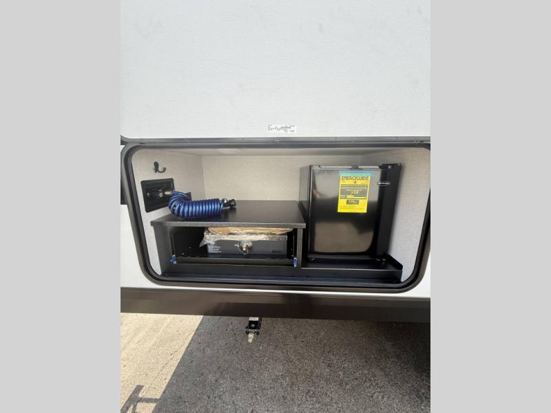 The exterior of the Jay Feather Air has its own list of standard features that make this entry-level Travel Trailer a must-have. We've stocked it with rear-mounted ladder for easy roof access, a maximized awning, an under-mount sewer hose carrier, a spare tire in case of emergencies and more.