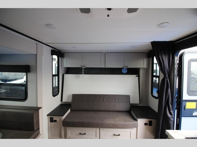 The double-size bunks in this travel trailer mean more friends and family can tag along! Once you arrive at the campground, you can put out the 15' power awning, unload the exterior storage and start lunch on the exterior griddle. A full kitchen indoors will let you make meals here when the weather isn't cooperating. The booth dinette slide will be perfect for meals times, game night, and even additional sleeping space. Up front, you'll find a sofa to relax on during the day and a Murphy bed to sleep on at night; how convenient!