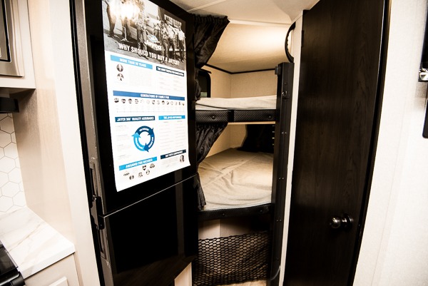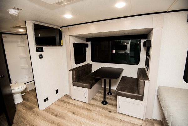 The double-size bunks in this travel trailer mean more friends and family can tag along! Once you arrive at the campground, you can put out the 15' power awning, unload the exterior storage and start lunch on the exterior griddle. A full kitchen indoors will let you make meals here when the weather isn't cooperating. The booth dinette slide will be perfect for meals times, game night, and even additional sleeping space. Up front, you'll find a sofa to relax on during the day and a Murphy bed to sleep on at night; how convenient!