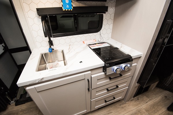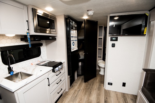 With any Jay Feather Air travel trailer by Jayco, you will enjoy lightweight towing and a variety of features to make each camping trip count! The Climate Shield insulation system helps by keeping you comfortable even in extreme weather conditions, and the Rock Solid jacks create a firm, steady foundation so your trailer feels solid underfoot and an easy setup. A rear roof ladder lets you easily clean the top of your Magnum Truss roof, and the 2" receiver will be perfect for your bike rack. The Overland 1 Solar Package with a 200W solar panel and 30-amp controller will provide off-grid capabilities, or you can choose the optional Overland 2 Solar Package with two panels instead! Each Jay Feather Air includes seamless countertops throughout, along with stainless steel sinks, decorative backsplash, and roller shades with a radiant barrier backer to help keep the sun's rays out.