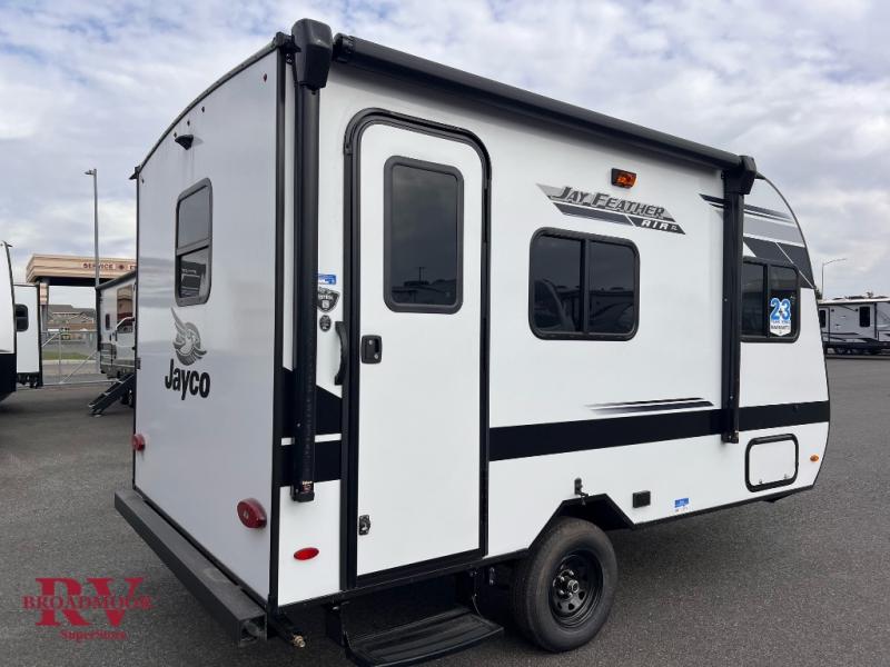 The Jay Feather Air SL travel trailer by Jayco is affordable, convenient, and lightweight for an easier tow! A Magnum Truss roof system and fully integrated A-frame provide a strong foundation to the trailer, plus there are galvanized-steel, impact resistant wheel wells for added protection. Some of the exterior conveniences you'll find include a front tongue jack and stabilizer jacks, roof mount solar prep, an exterior porch light, and G20 dark tinted privacy windows. Head inside to enjoy solid hardwood cabinet doors, residential-style kitchen countertops, a marine-grade toilet with foot flush, and vinyl flooring throughout that will be easy to keep clean. This super lite travel trailer is the perfect choice for rookie RVers and seasoned campers alike!