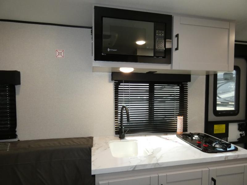 You'll love camping in this lightweight and versatile travel trailer! Once you've arrived at the campground and have unpacked your things, you can make a quick lunch on the two-burner cooktop. There are two 32" x 74" twin-size bed/benches that include a table for a king-size bed conversion, and you'll find a large overhead cabinet here to keep books or board games stored away. A private bath includes a shower and a toilet to easily clean up each day, and a dresser just outside the bath will let you keep clothes or towels organized. Don't let this cozy travel trailer slip away!
