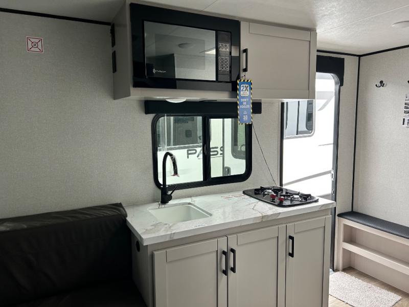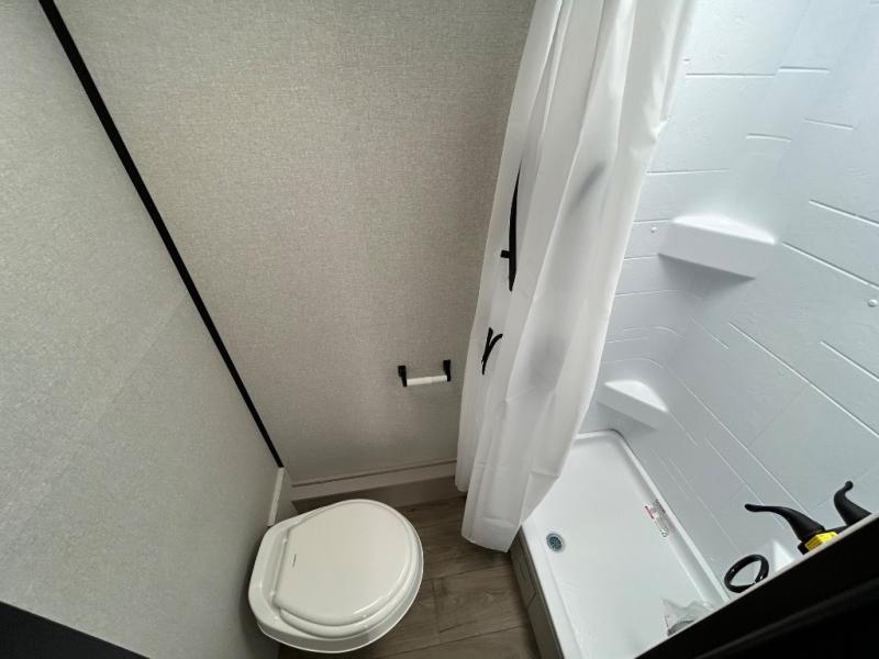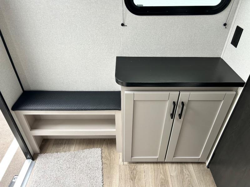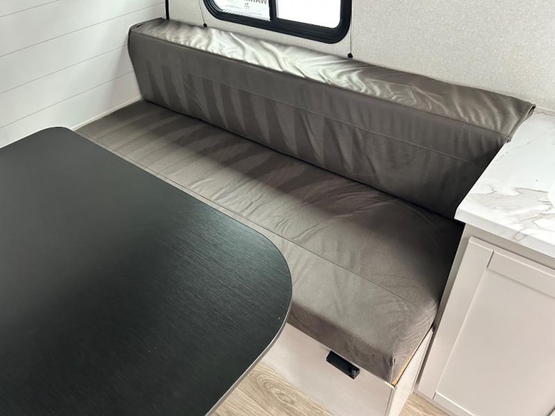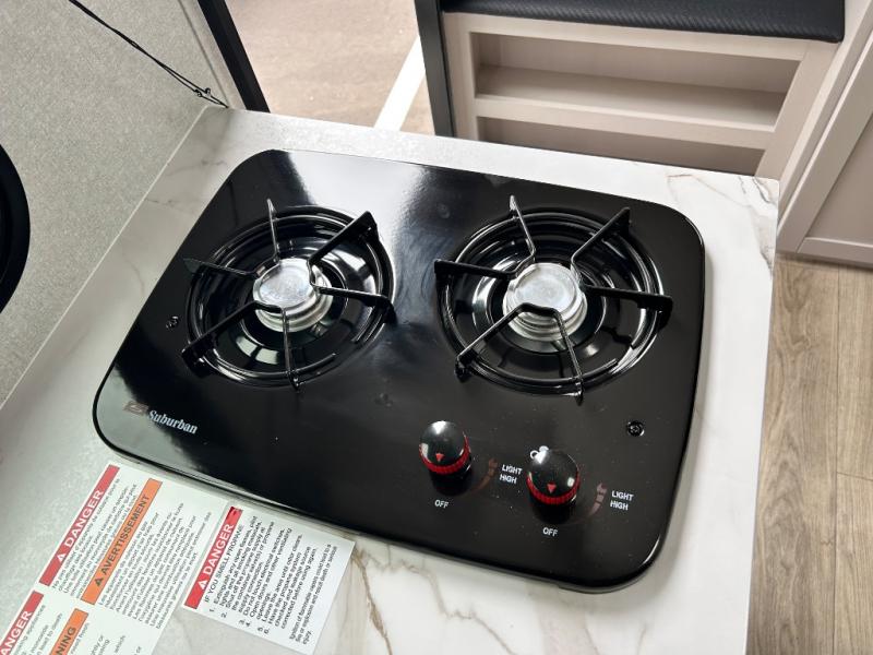 You'll love camping in this lightweight and versatile travel trailer! Once you've arrived at the campground and have unpacked your things, you can make a quick lunch on the two-burner cooktop. There are two 32" x 74" twin-size bed/benches that include a table for a king-size bed conversion, and you'll find a large overhead cabinet here to keep books or board games stored away. A private bath includes a shower and a toilet to easily clean up each day, and a dresser just outside the bath will let you keep clothes or towels organized. Don't let this cozy travel trailer slip away!