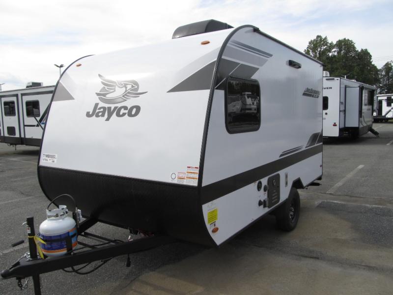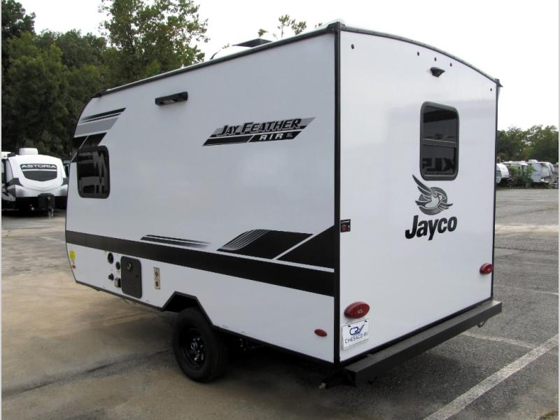 The Jay Feather Air SL travel trailer by Jayco is affordable, convenient, and lightweight for an easier tow! A Magnum Truss roof system and fully integrated A-frame provide a strong foundation to the trailer, plus there are galvanized-steel, impact resistant wheel wells for added protection. Some of the exterior conveniences you'll find include a front tongue jack and stabilizer jacks, roof mount solar prep, an exterior porch light, and G20 dark tinted privacy windows. Head inside to enjoy solid hardwood cabinet doors, residential-style kitchen countertops, a marine-grade toilet with foot flush, and vinyl flooring throughout that will be easy to keep clean. This super lite travel trailer is the perfect choice for rookie RVers and seasoned campers alike!