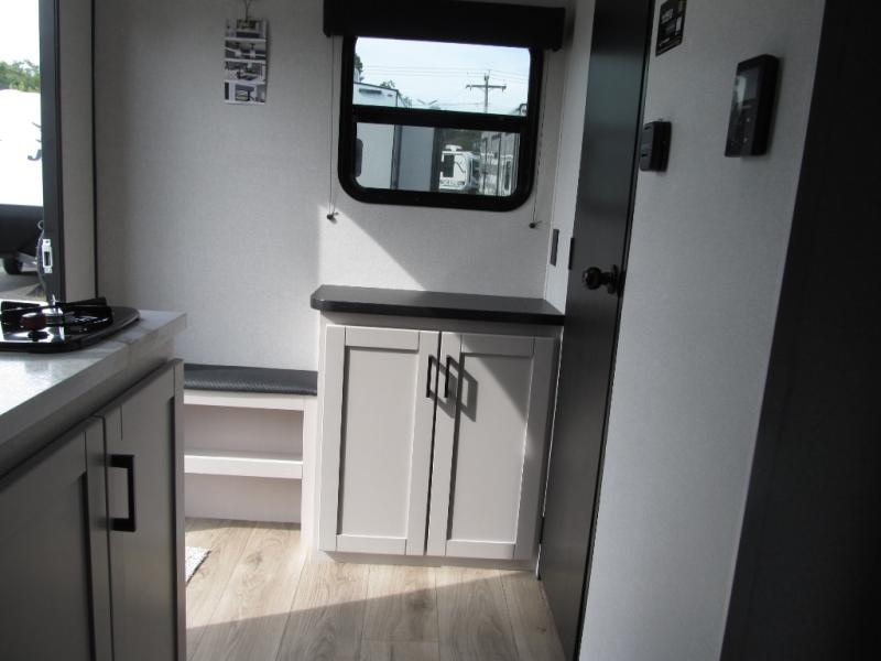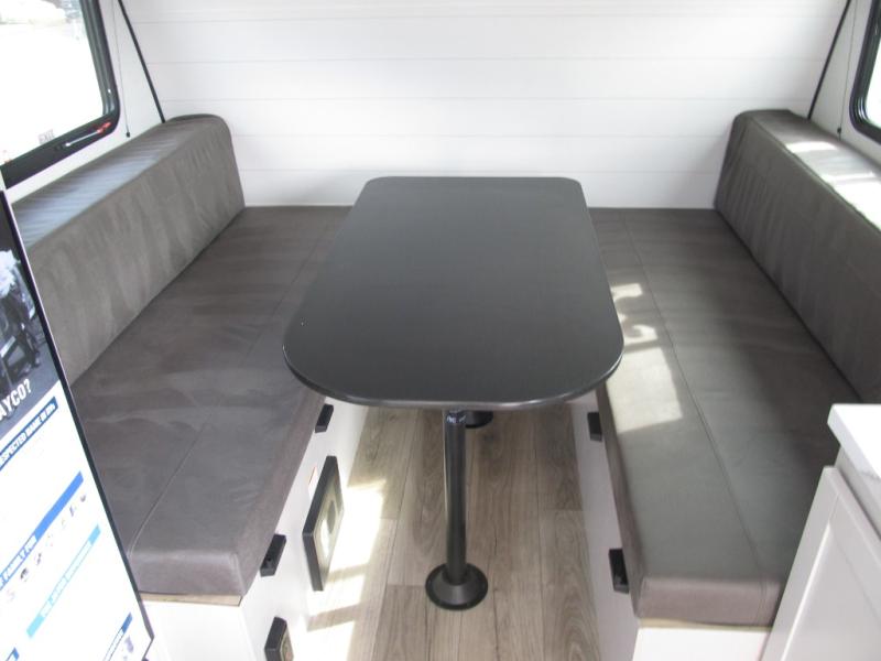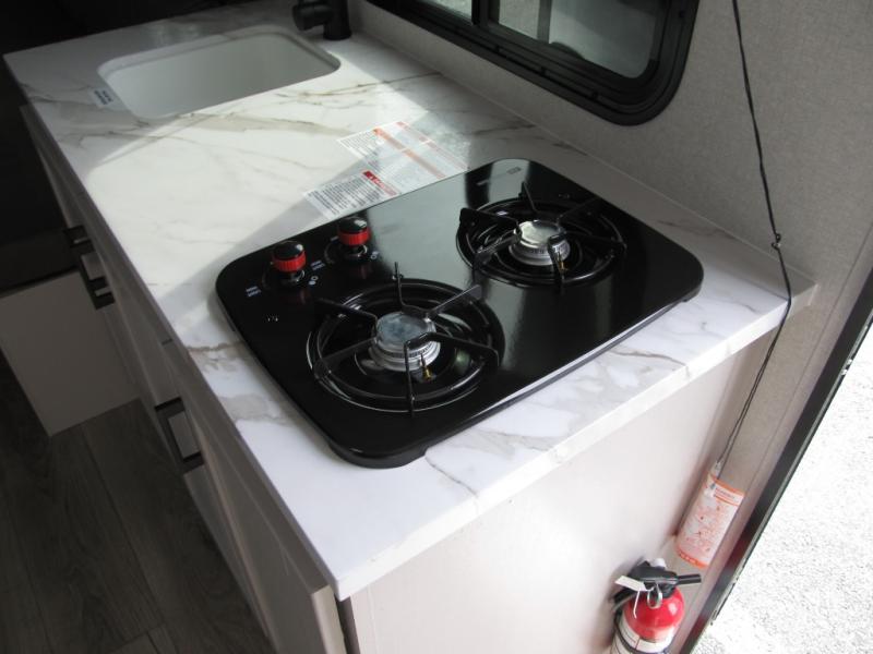 You'll love camping in this lightweight and versatile travel trailer! Once you've arrived at the campground and have unpacked your things, you can make a quick lunch on the two-burner cooktop. There are two 32" x 74" twin-size bed/benches that include a table for a king-size bed conversion, and you'll find a large overhead cabinet here to keep books or board games stored away. A private bath includes a shower and a toilet to easily clean up each day, and a dresser just outside the bath will let you keep clothes or towels organized. Don't let this cozy travel trailer slip away!