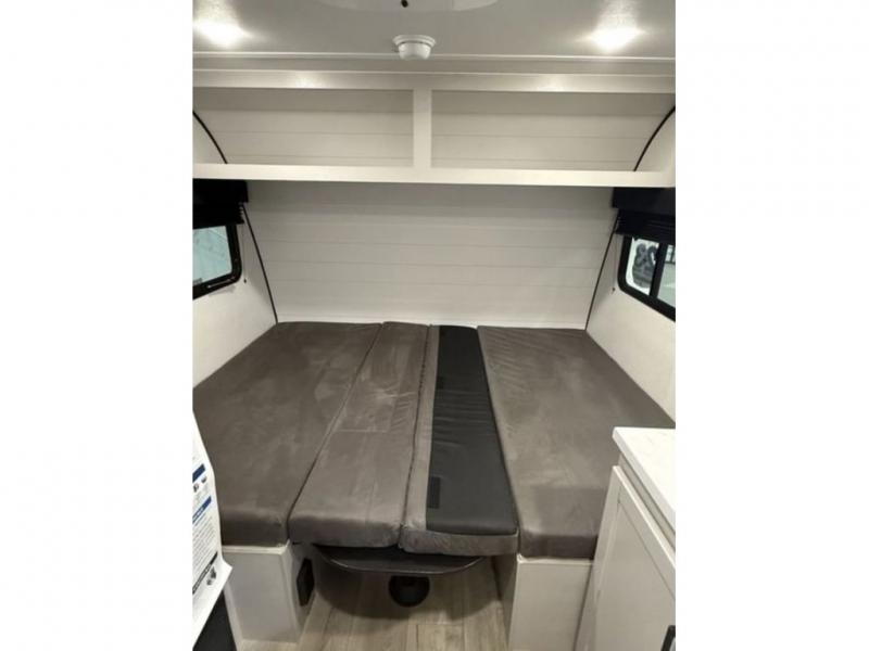 You'll love camping in this lightweight and versatile travel trailer! Once you've arrived at the campground and have unpacked your things, you can make a quick lunch on the two-burner cooktop. There are two 32" x 74" twin-size bed/benches that include a table for a king-size bed conversion, and you'll find a large overhead cabinet here to keep books or board games stored away. A private bath includes a shower and a toilet to easily clean up each day, and a dresser just outside the bath will let you keep clothes or towels organized. Don't let this cozy travel trailer slip away!