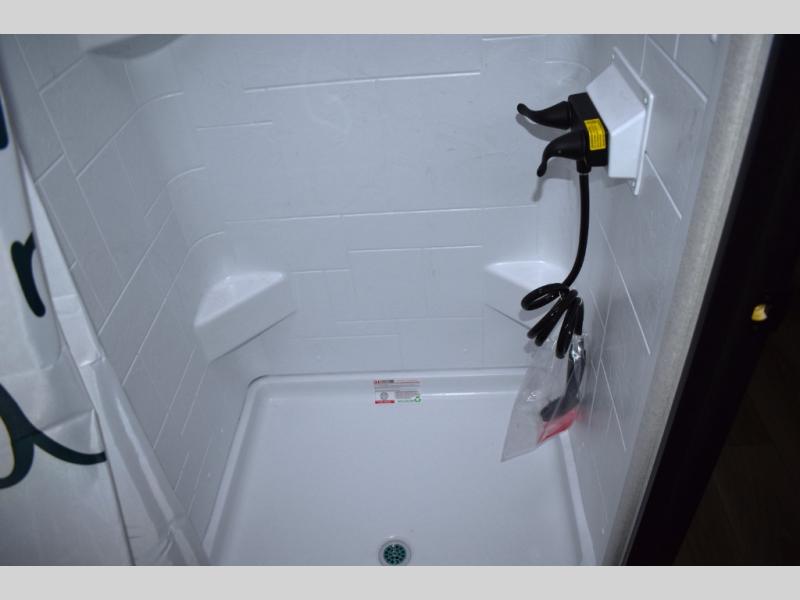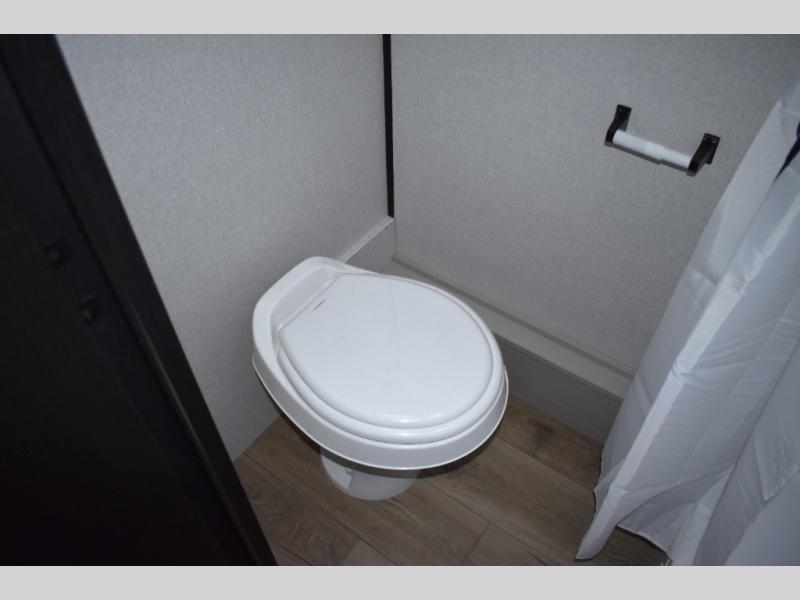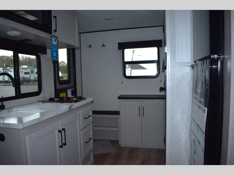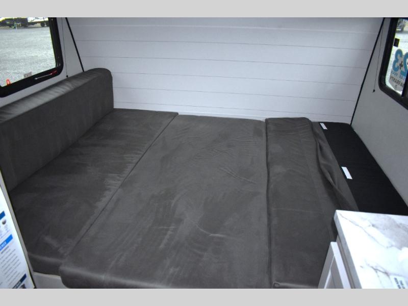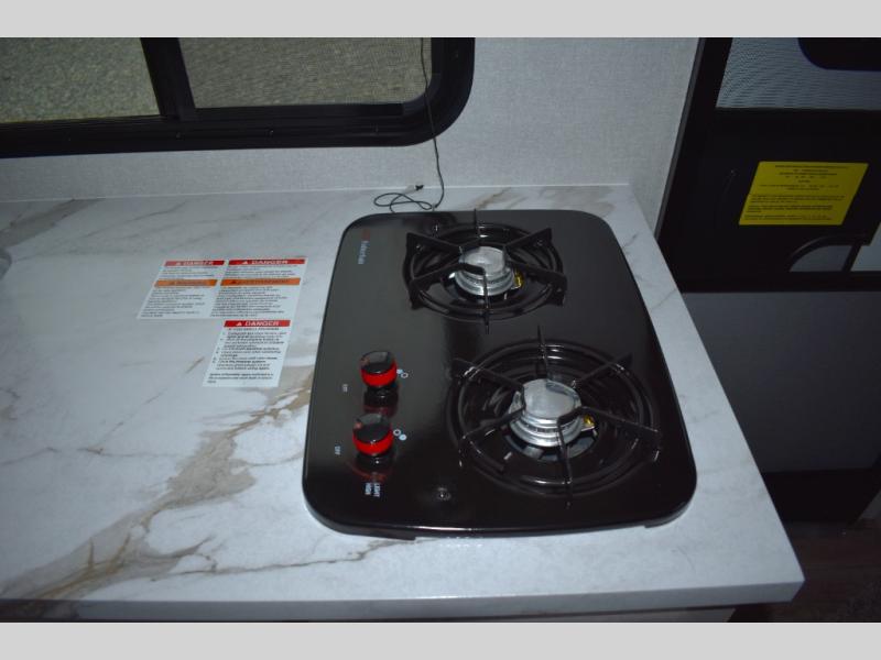 You'll love camping in this lightweight and versatile travel trailer! Once you've arrived at the campground and have unpacked your things, you can make a quick lunch on the two-burner cooktop. There are two 32" x 74" twin-size bed/benches that include a table for a king-size bed conversion, and you'll find a large overhead cabinet here to keep books or board games stored away. A private bath includes a shower and a toilet to easily clean up each day, and a dresser just outside the bath will let you keep clothes or towels organized. Don't let this cozy travel trailer slip away!