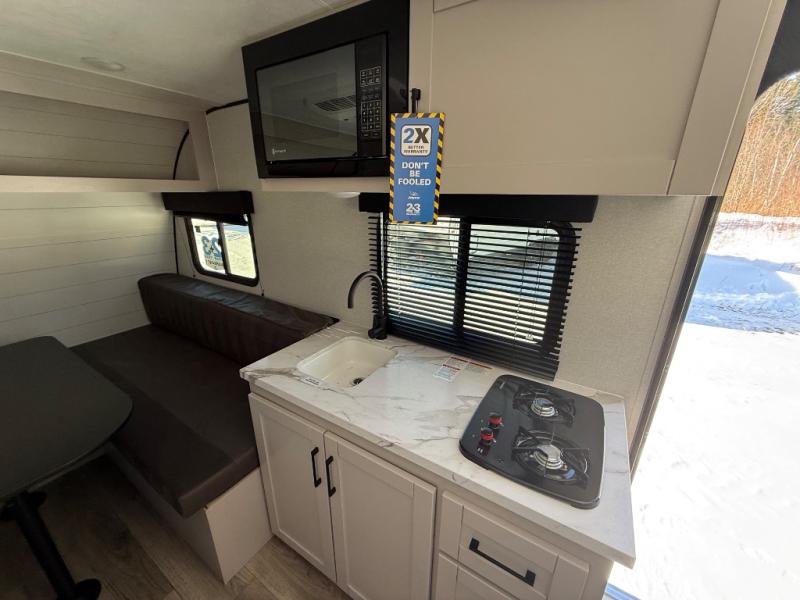 You'll love camping in this lightweight and versatile travel trailer! Once you've arrived at the campground and have unpacked your things, you can make a quick lunch on the two-burner cooktop. There are two 32" x 74" twin-size bed/benches that include a table for a king-size bed conversion, and you'll find a large overhead cabinet here to keep books or board games stored away. A private bath includes a shower and a toilet to easily clean up each day, and a dresser just outside the bath will let you keep clothes or towels organized. Don't let this cozy travel trailer slip away!