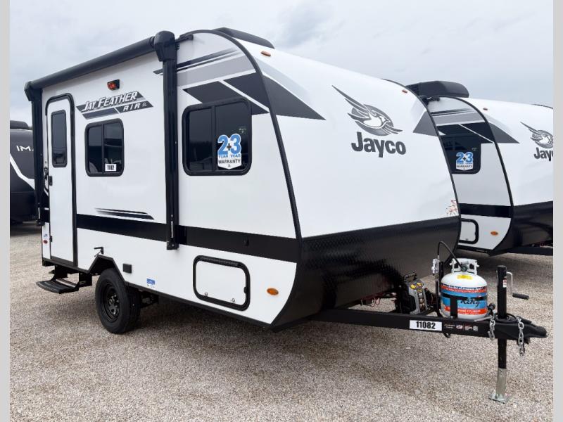 The Jay Feather Air SL travel trailer by Jayco is affordable, convenient, and lightweight for an easier tow! A Magnum Truss roof system and fully integrated A-frame provide a strong foundation to the trailer, plus there are galvanized-steel, impact resistant wheel wells for added protection. Some of the exterior conveniences you'll find include a front tongue jack and stabilizer jacks, roof mount solar prep, an exterior porch light, and G20 dark tinted privacy windows. Head inside to enjoy solid hardwood cabinet doors, residential-style kitchen countertops, a marine-grade toilet with foot flush, and vinyl flooring throughout that will be easy to keep clean. This super lite travel trailer is the perfect choice for rookie RVers and seasoned campers alike!