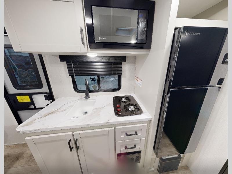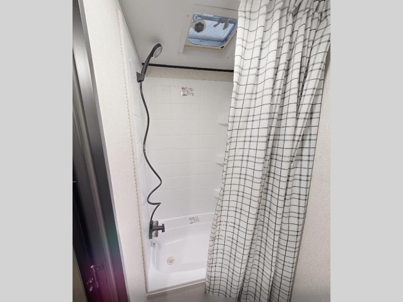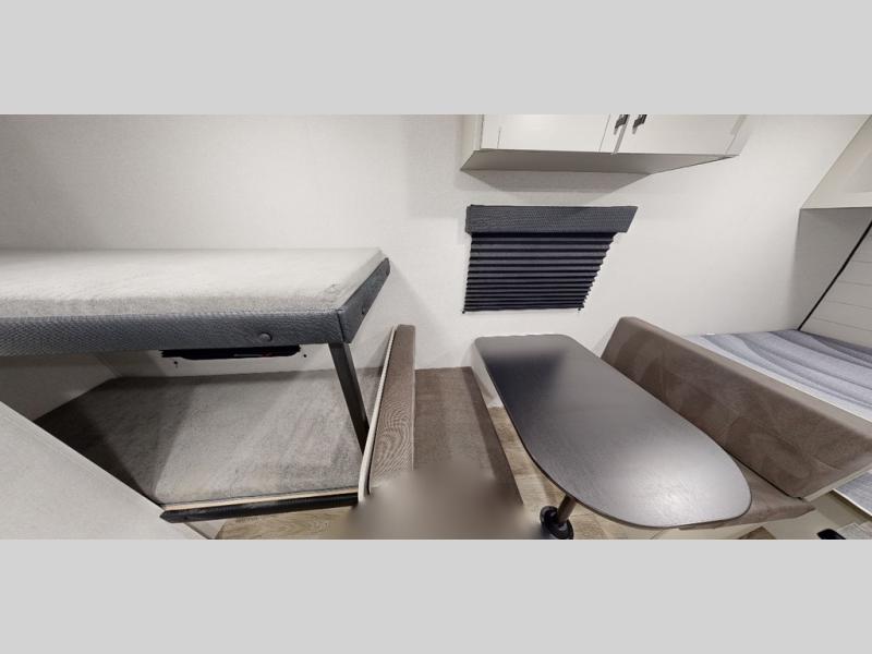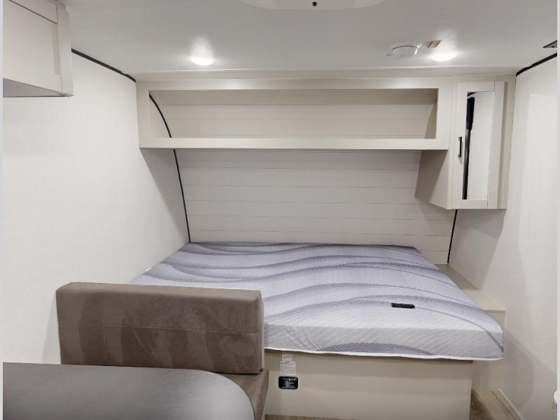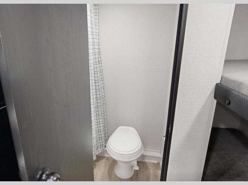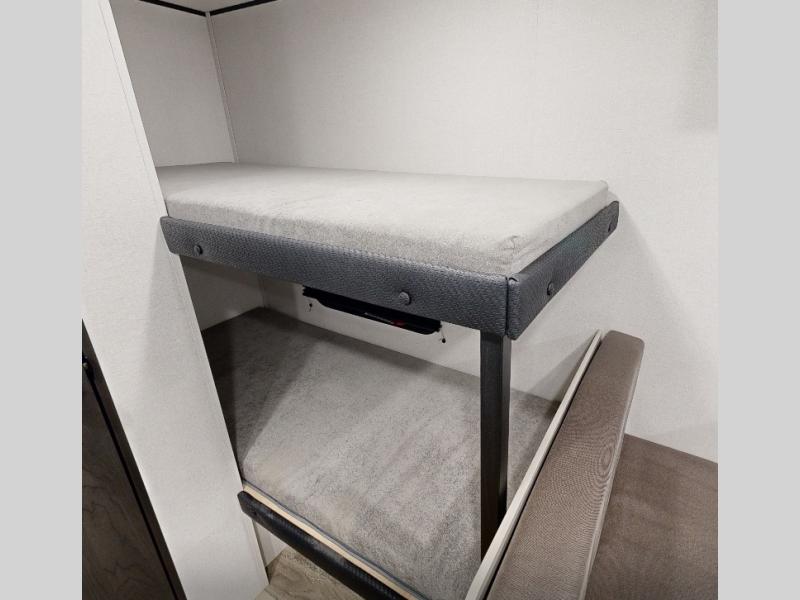 This compact travel trailer has everything you need for convenient camping trips! Once you arrive at the park, you can unload the exterior storage and put out the 10' power awning. The two burner cooktop and microwave oven will let you make lunch for your crew, and there is a 5 cu. ft. 12V refrigerator to keep your cold items fresh. A booth dinette will provide dining space when you don't want to eat outdoors, and this can convert to sleeping space for one guest or two little ones. You'll appreciate the private bath with a toilet and 36" tub/shower to freshen up in each day, and the bunk beds in the back provide compact sleeping space for more campers. The front queen bed will be reserved just for you, and there is a nightstand, wardrobe, and overhead cabinet here to keep your things tidy!