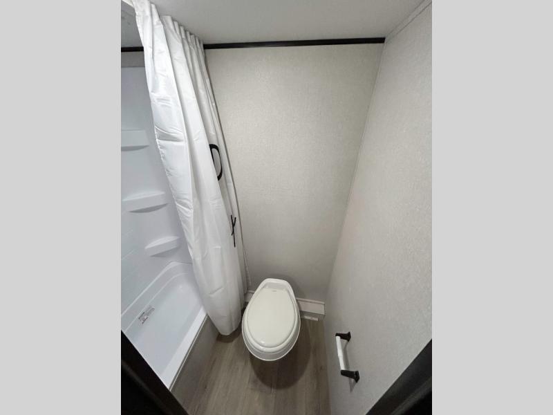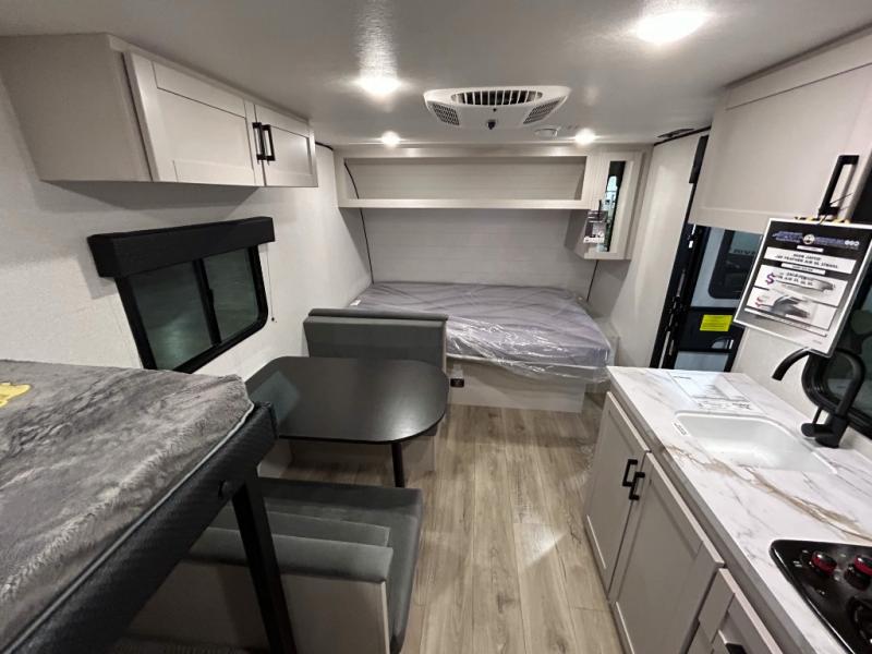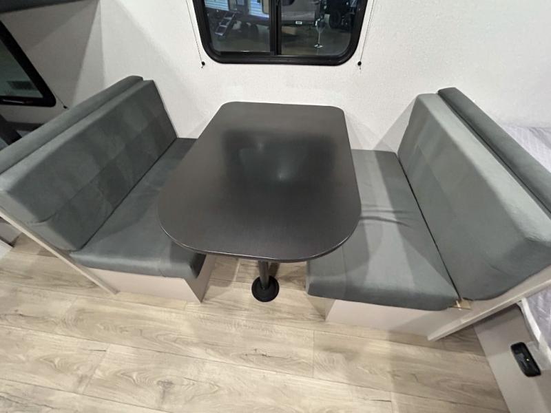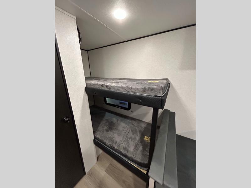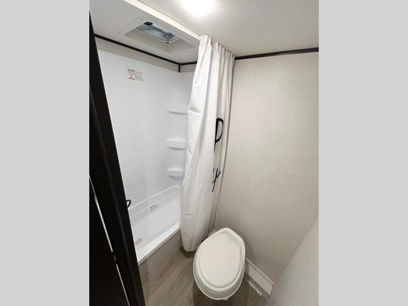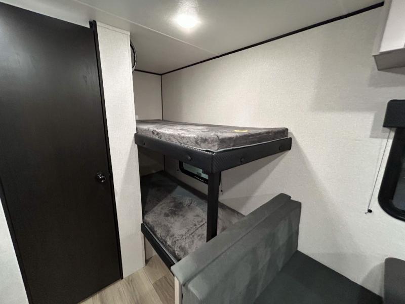 This compact travel trailer has everything you need for convenient camping trips! Once you arrive at the park, you can unload the exterior storage and put out the 10' power awning. The two burner cooktop and microwave oven will let you make lunch for your crew, and there is a 5 cu. ft. 12V refrigerator to keep your cold items fresh. A booth dinette will provide dining space when you don't want to eat outdoors, and this can convert to sleeping space for one guest or two little ones. You'll appreciate the private bath with a toilet and 36" tub/shower to freshen up in each day, and the bunk beds in the back provide compact sleeping space for more campers. The front queen bed will be reserved just for you, and there is a nightstand, wardrobe, and overhead cabinet here to keep your things tidy!