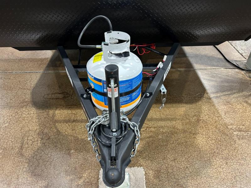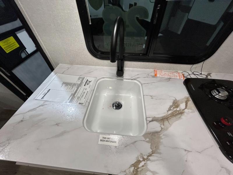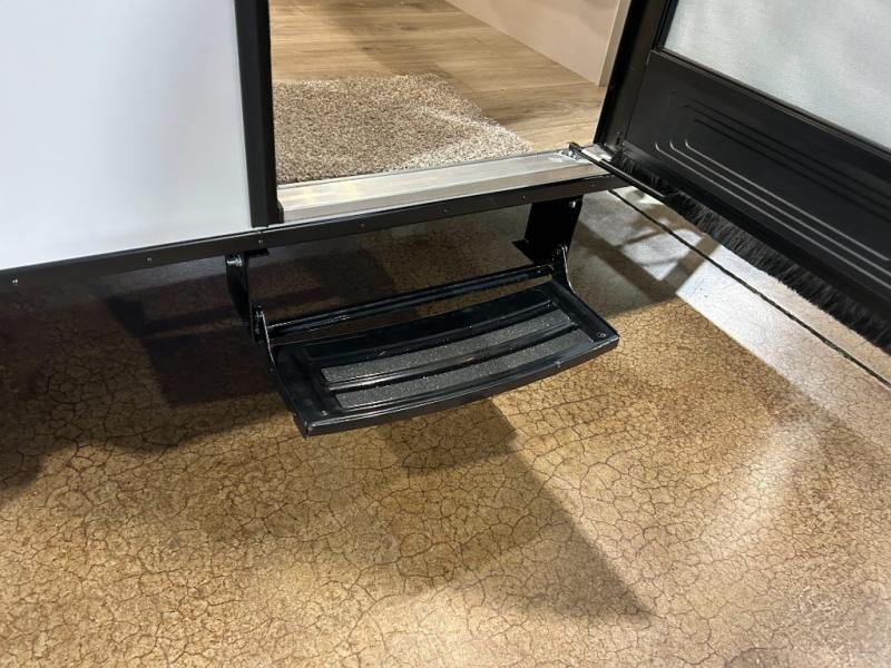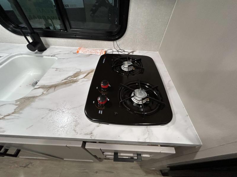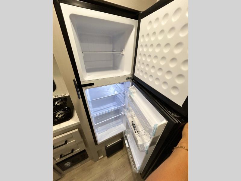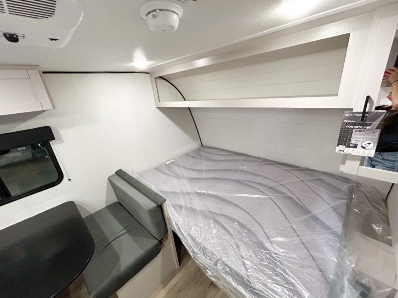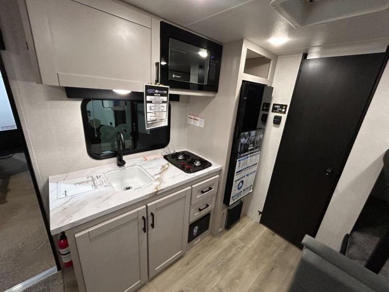 This compact travel trailer has everything you need for convenient camping trips! Once you arrive at the park, you can unload the exterior storage and put out the 10' power awning. The two burner cooktop and microwave oven will let you make lunch for your crew, and there is a 5 cu. ft. 12V refrigerator to keep your cold items fresh. A booth dinette will provide dining space when you don't want to eat outdoors, and this can convert to sleeping space for one guest or two little ones. You'll appreciate the private bath with a toilet and 36" tub/shower to freshen up in each day, and the bunk beds in the back provide compact sleeping space for more campers. The front queen bed will be reserved just for you, and there is a nightstand, wardrobe, and overhead cabinet here to keep your things tidy!