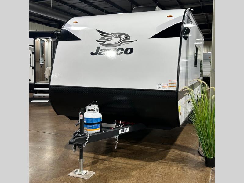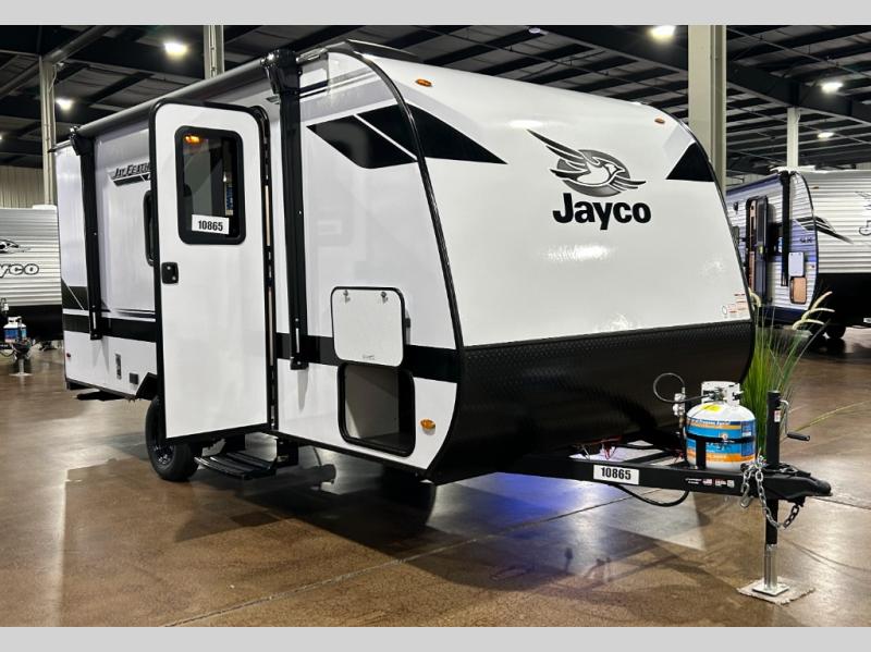 The Jay Feather Air SL travel trailer by Jayco is affordable, convenient, and lightweight for an easier tow! A Magnum Truss roof system and fully integrated A-frame provide a strong foundation to the trailer, plus there are galvanized-steel, impact resistant wheel wells for added protection. Some of the exterior conveniences you'll find include a front tongue jack and stabilizer jacks, roof mount solar prep, an exterior porch light, and G20 dark tinted privacy windows. Head inside to enjoy solid hardwood cabinet doors, residential-style kitchen countertops, a marine-grade toilet with foot flush, and vinyl flooring throughout that will be easy to keep clean. This super lite travel trailer is the perfect choice for rookie RVers and seasoned campers alike!